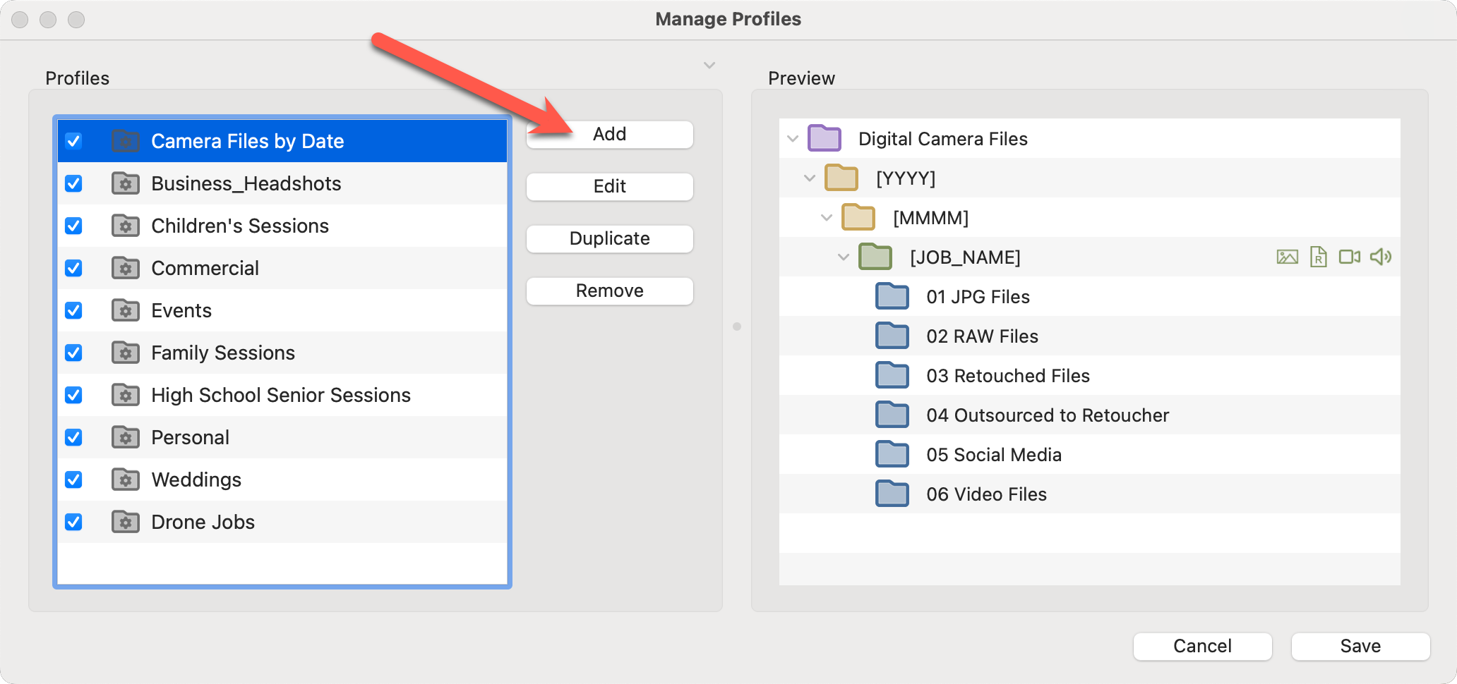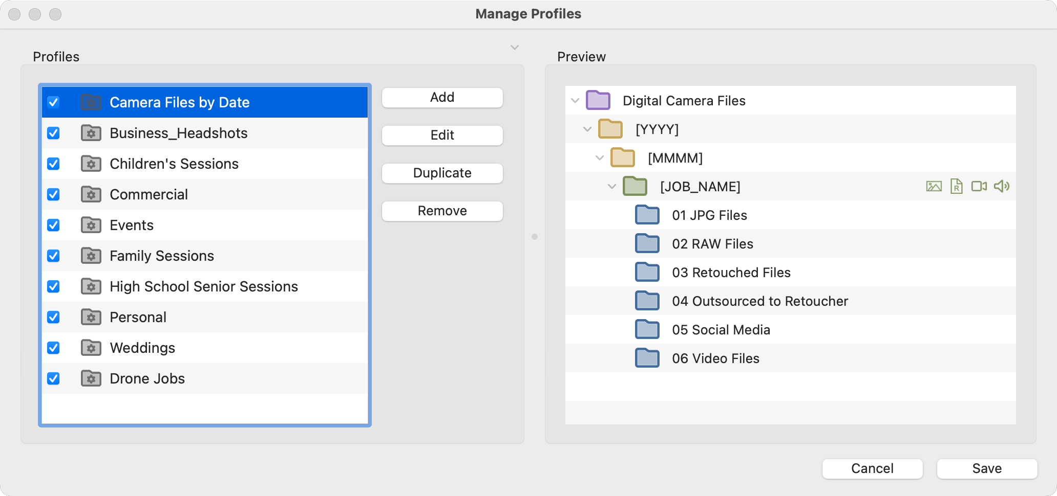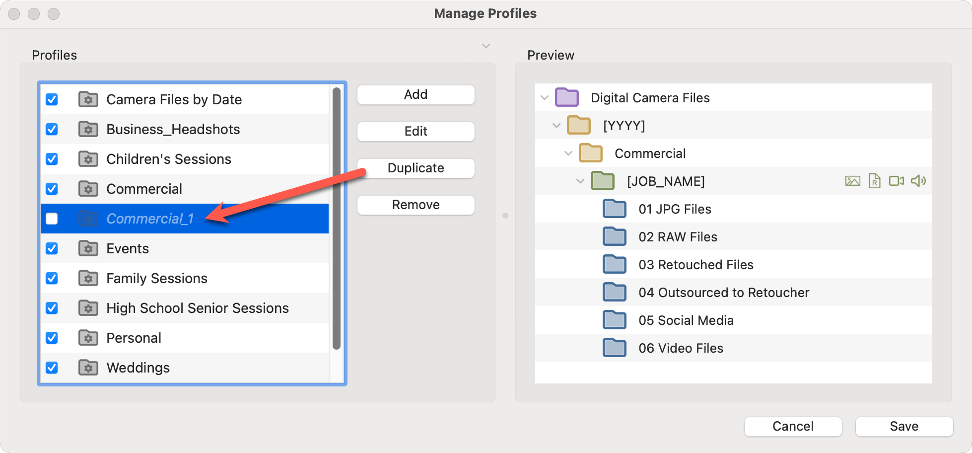 Duplicating a profile allows you to retain the same base settings—such as folder locations, job structure, and renaming options—while making a few minor adjustments to tailor it for a specific job type.  It’s faster, more consistent, and helps prevent setup mistakes compared to starting from a blank profile.