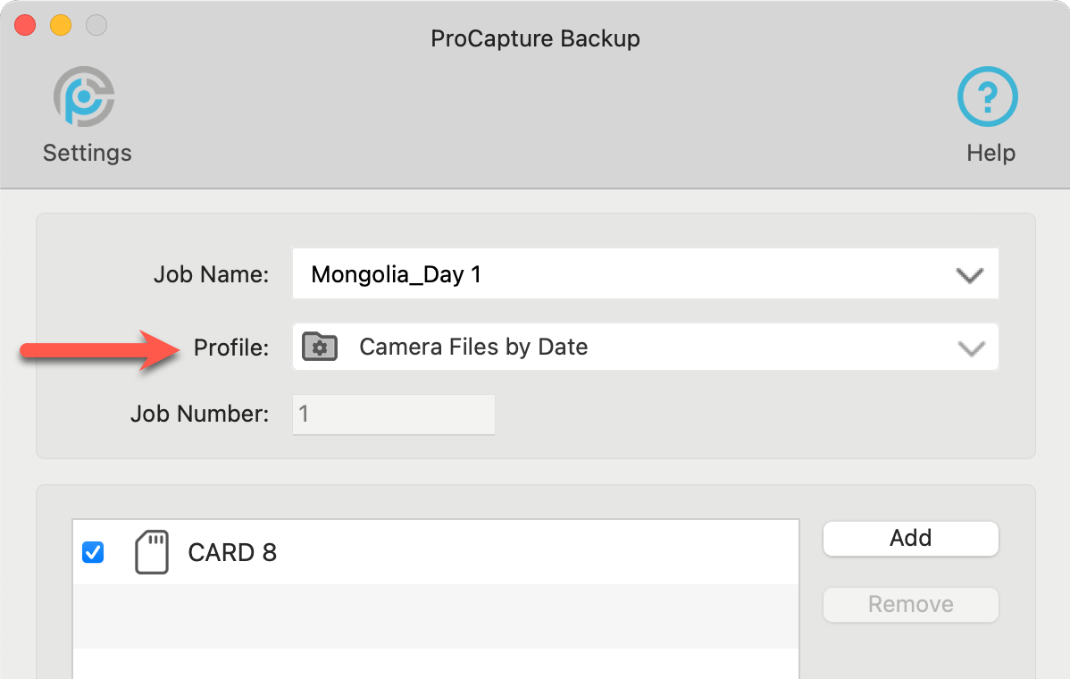 Profiles are pre-set configurations that you create to manage how your images are processed and organized after they are offloaded from your camera to your computer.  A profile must be selected before a card can be offloaded.  ProCapture Backup comes preloaded with a number of commonly used profiles to choose from.