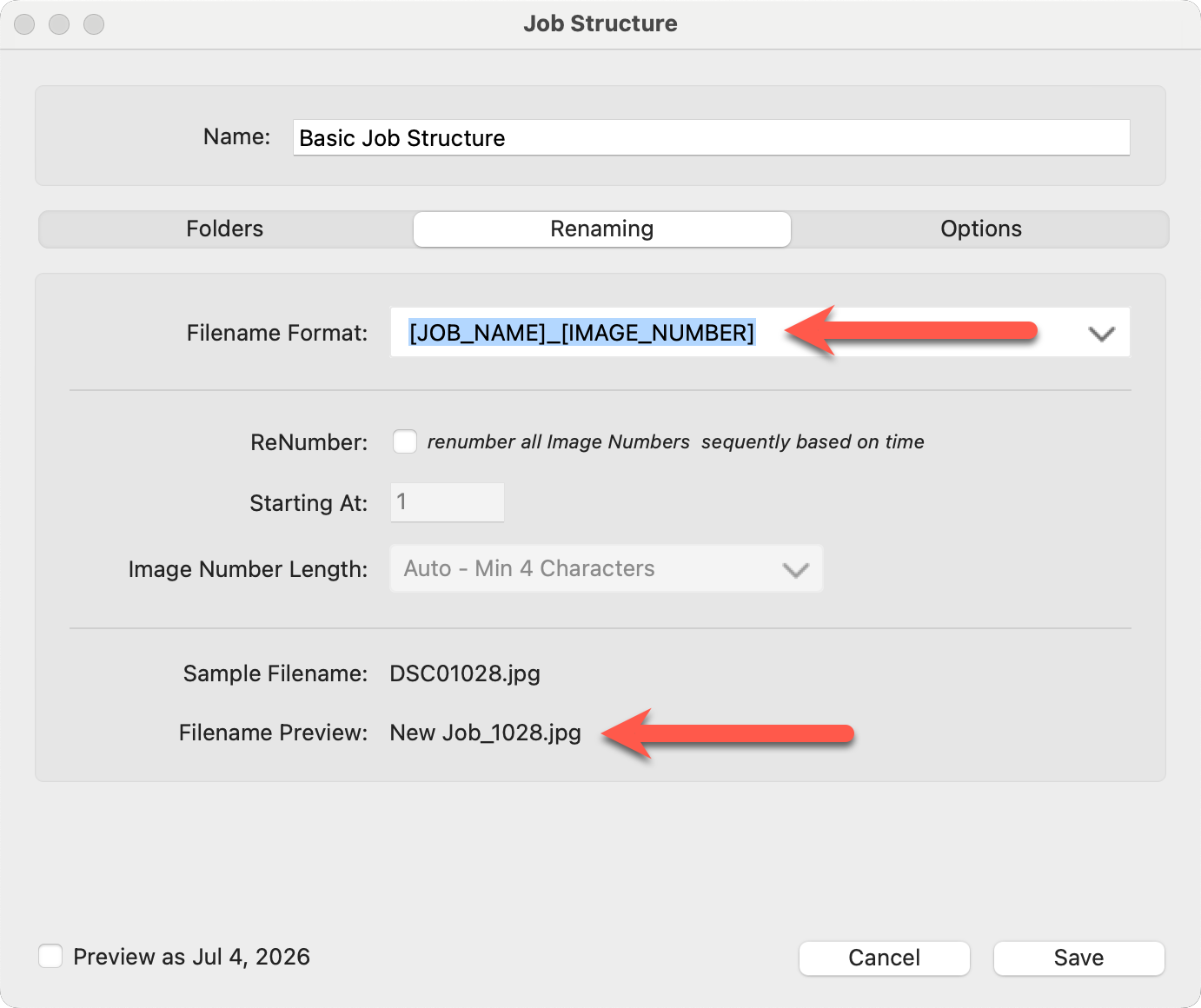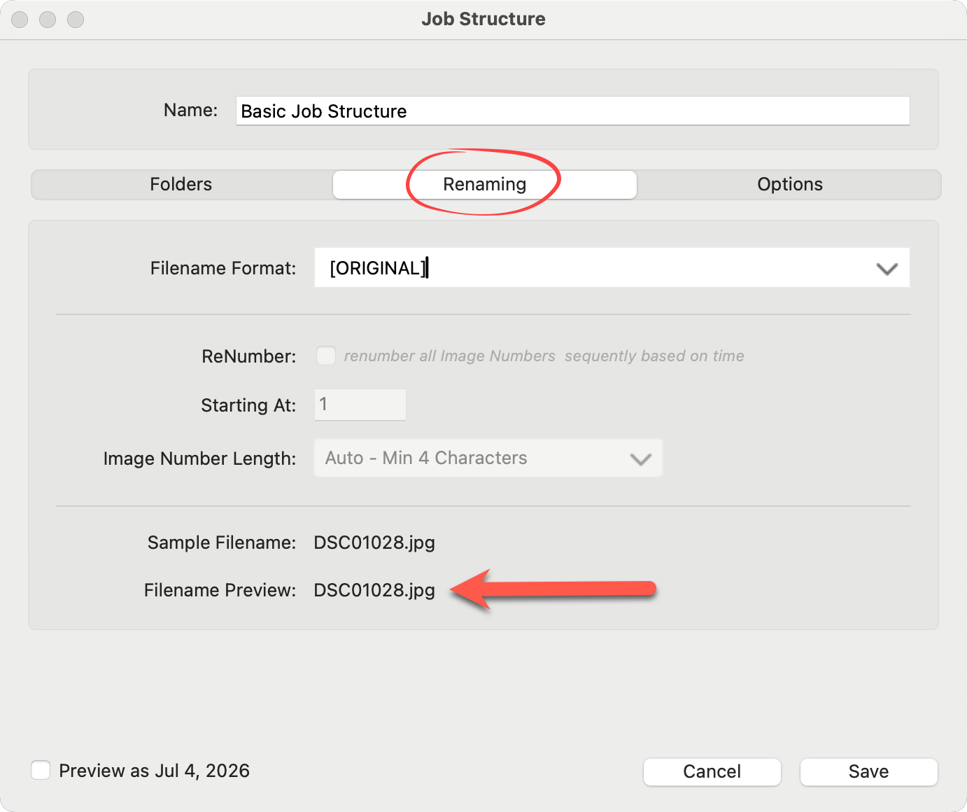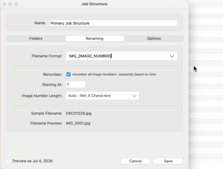 Renaming files in ProCapture Backup™ helps keep your images organized, consistent, and easy to find—especially when you’re working with multiple memory cards. When you merge cards, you can also renumber the files to maintain a clean, uninterrupted sequence across the entire job. This prevents duplicate file names and keeps your images in the correct order from start to finish. Renaming is handled in the "Renaming" tab within the Job Structure.