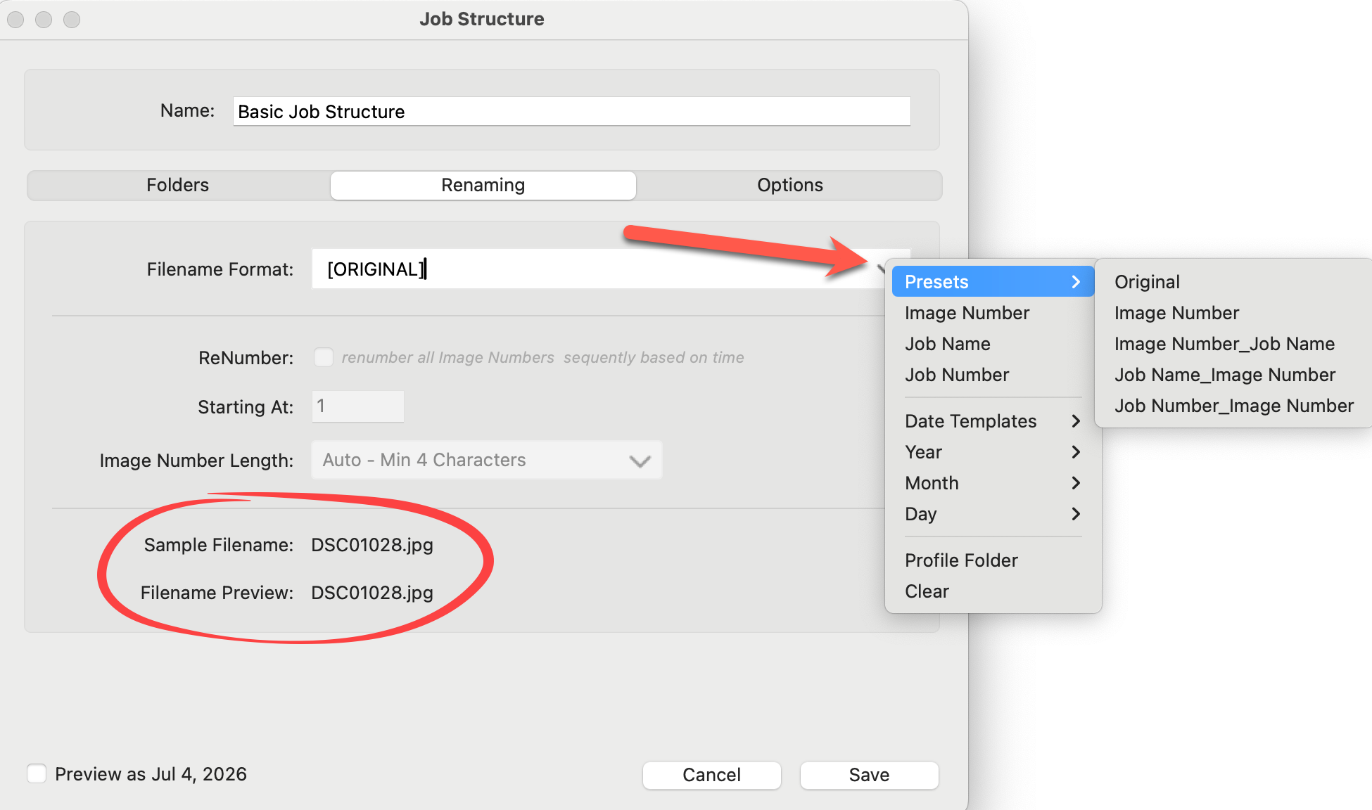 - A preview of your selections appears in the Filename Preview.
