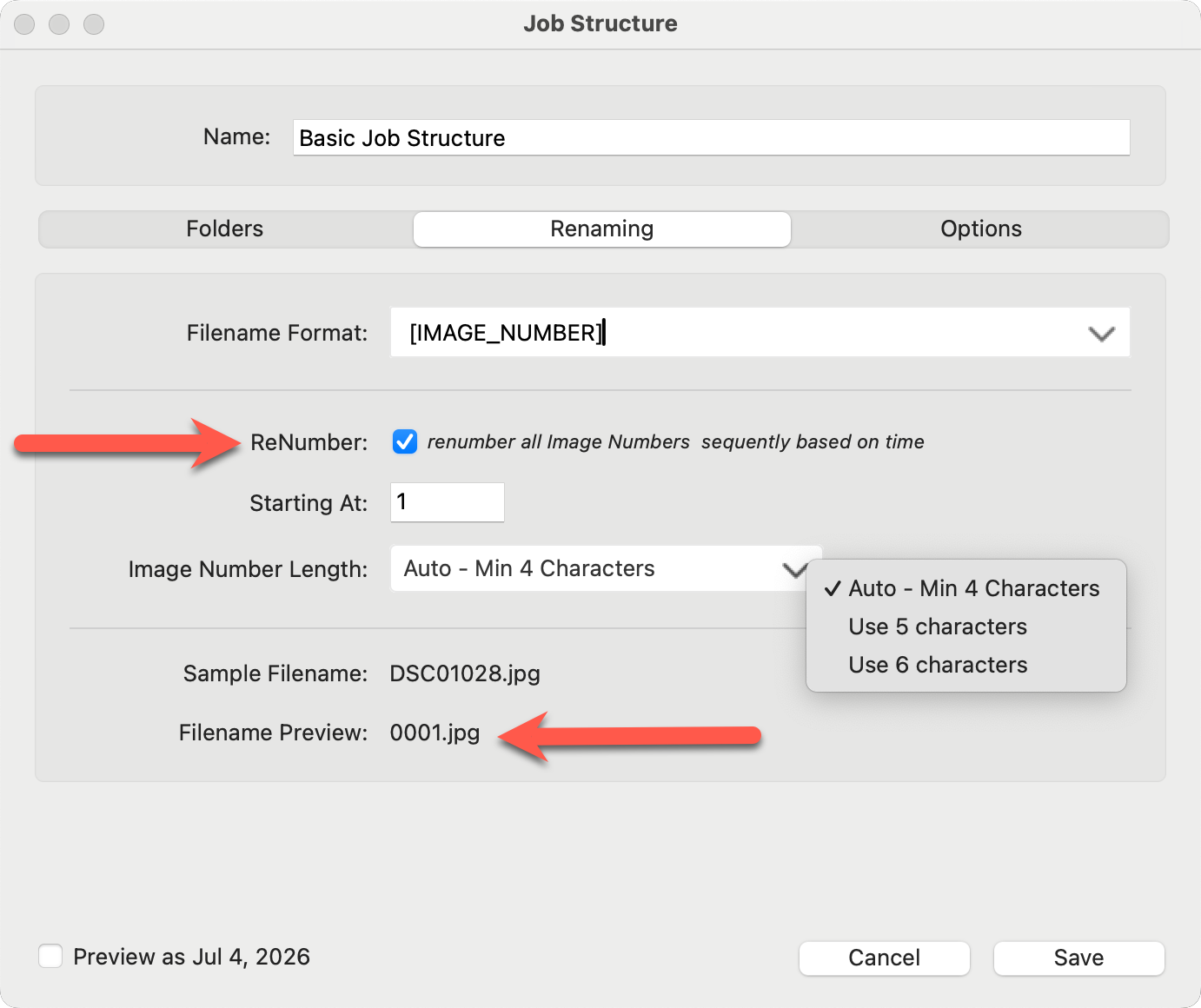 - Optionally select an "Image Number Length." By default, 4 characters are used.