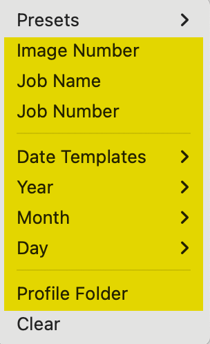 You can also use dynamic text such as dates, job names, job numbers, and image numbers to build your own filename format. See Build My Own Format.