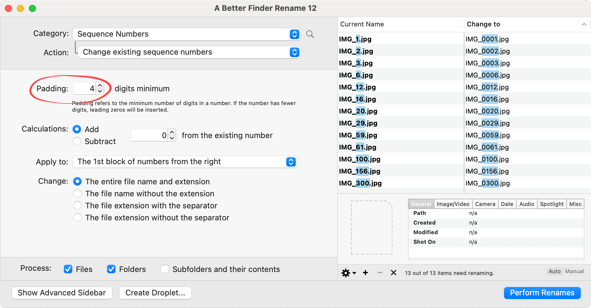 Many cameras already create padded filenames. Lightroom and Bridge can also be set to rename this way. Bulk tools like Better Finder Rename (Mac) or Better File Rename (Windows) can fix sequences quickly.