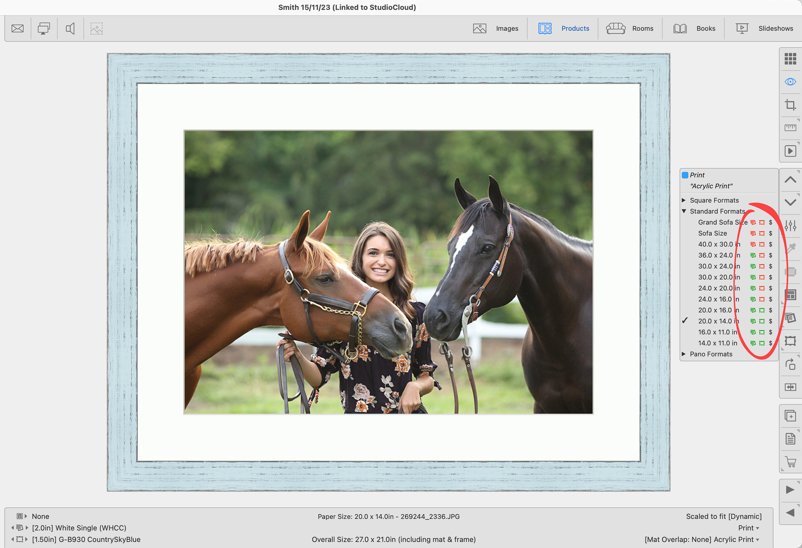 In the following example, we are framing a 16 x 20 print. It is a common size, so all of the ACI frames are available as indicated by the green frame tags.