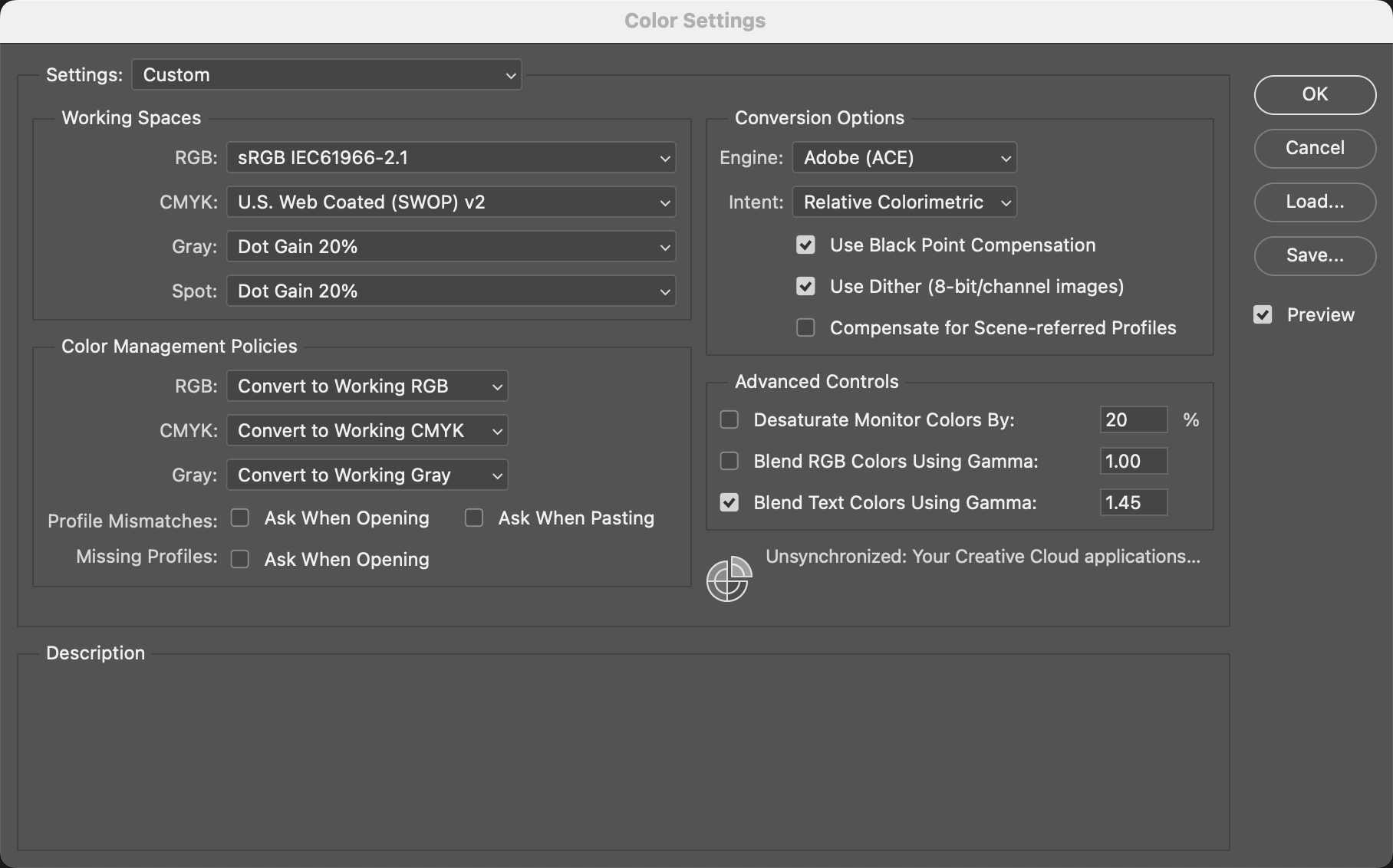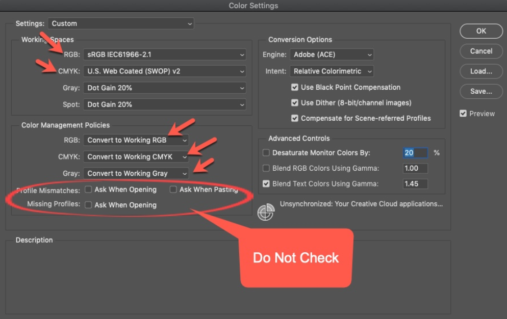 These settings will automatically convert any image you open in Photoshop to your preferred color settings and bypass profile mismatch warnings. Once you have adjusted all these settings, the first image you open with an embedded profile different from your chosen settings will display a profile mismatch warning. Check the "Don't show again" box, then click OK. You will no longer receive warnings, and all images will open with your preferred color profile embedded. These settings will also be applied during Pro Production.