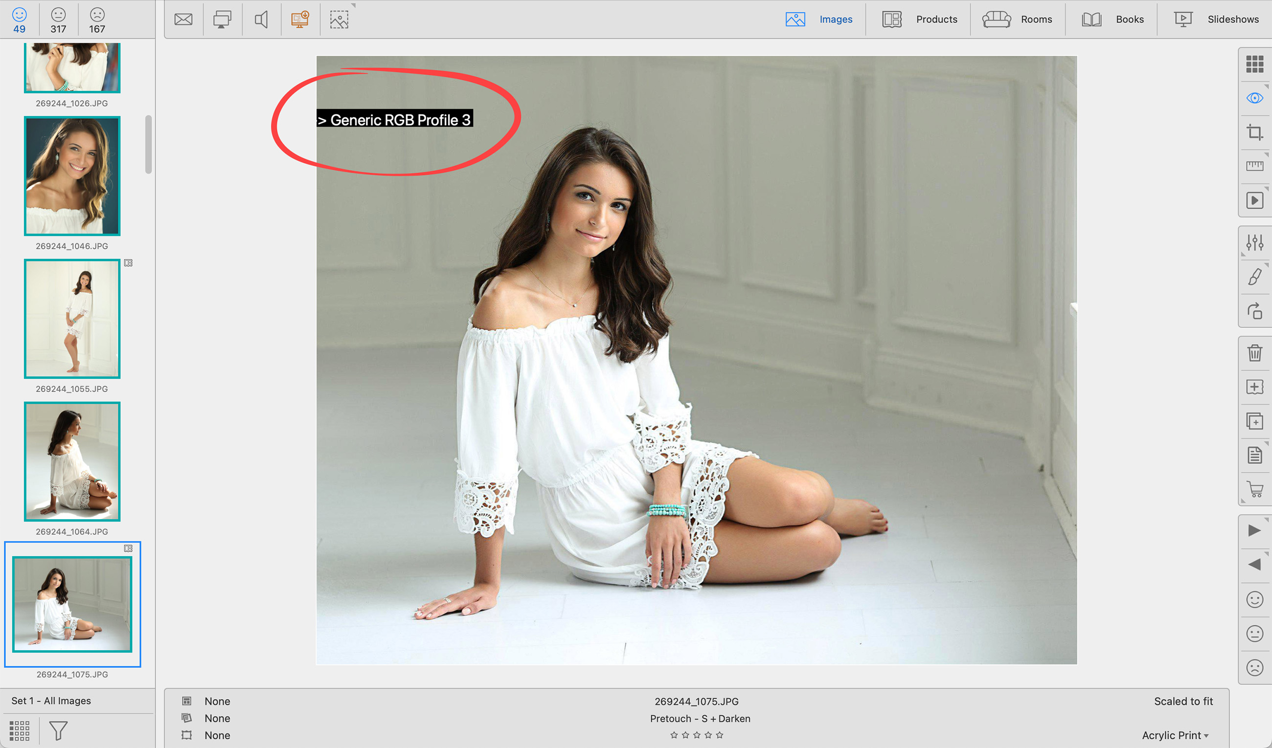 If the colors of the images displayed in ProSelect do not match the colors of the source files, it is likely because the imported image does not have an embedded color profile. To check the embedded color profile of a source image, follow these steps: