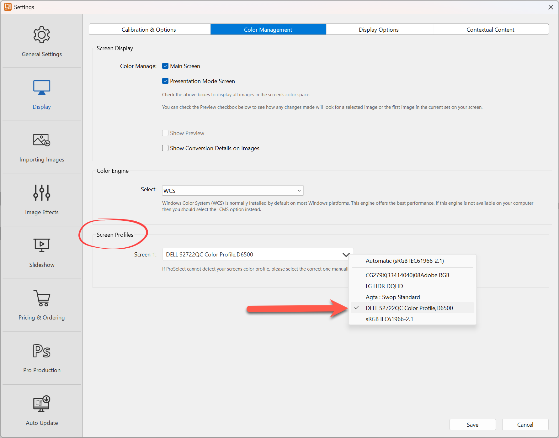 - In the "Screen Profiles" section, you can select each screen being used and assign a specific ICC color profile from your system. You’ll need to know which profile corresponds to your monitor—this is typically created by a calibration tool like X-Rite or Datacolor, or provided by the monitor manufacturer.