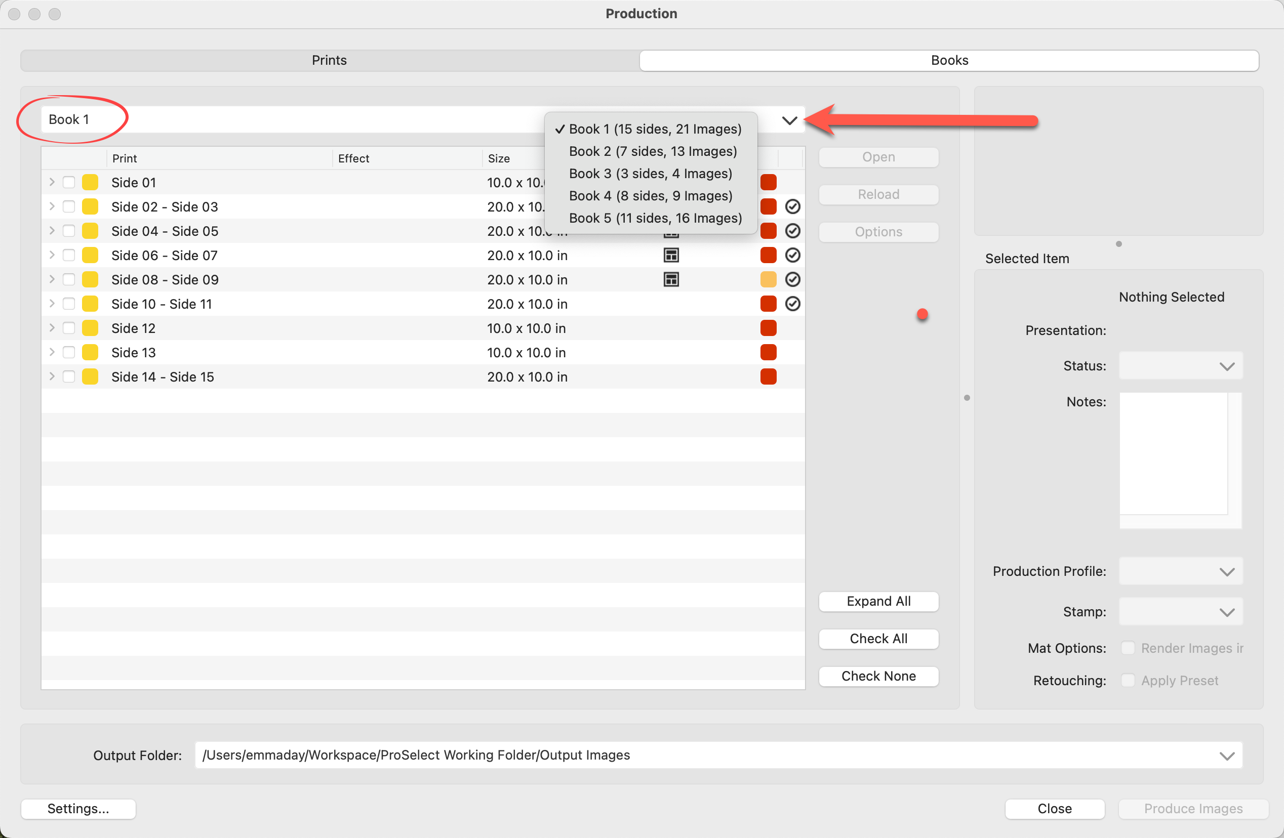 For composite book pages, when you run Production, all images are automatically exported to a distinct subfolder within the chosen Output Folder. This subfolder's name combines the book's name and its design name. The naming convention for the image files uses “Side X” or “Side X-Y” to identify their sequence within the book. E.g. Side 06 - Side 07.jpg