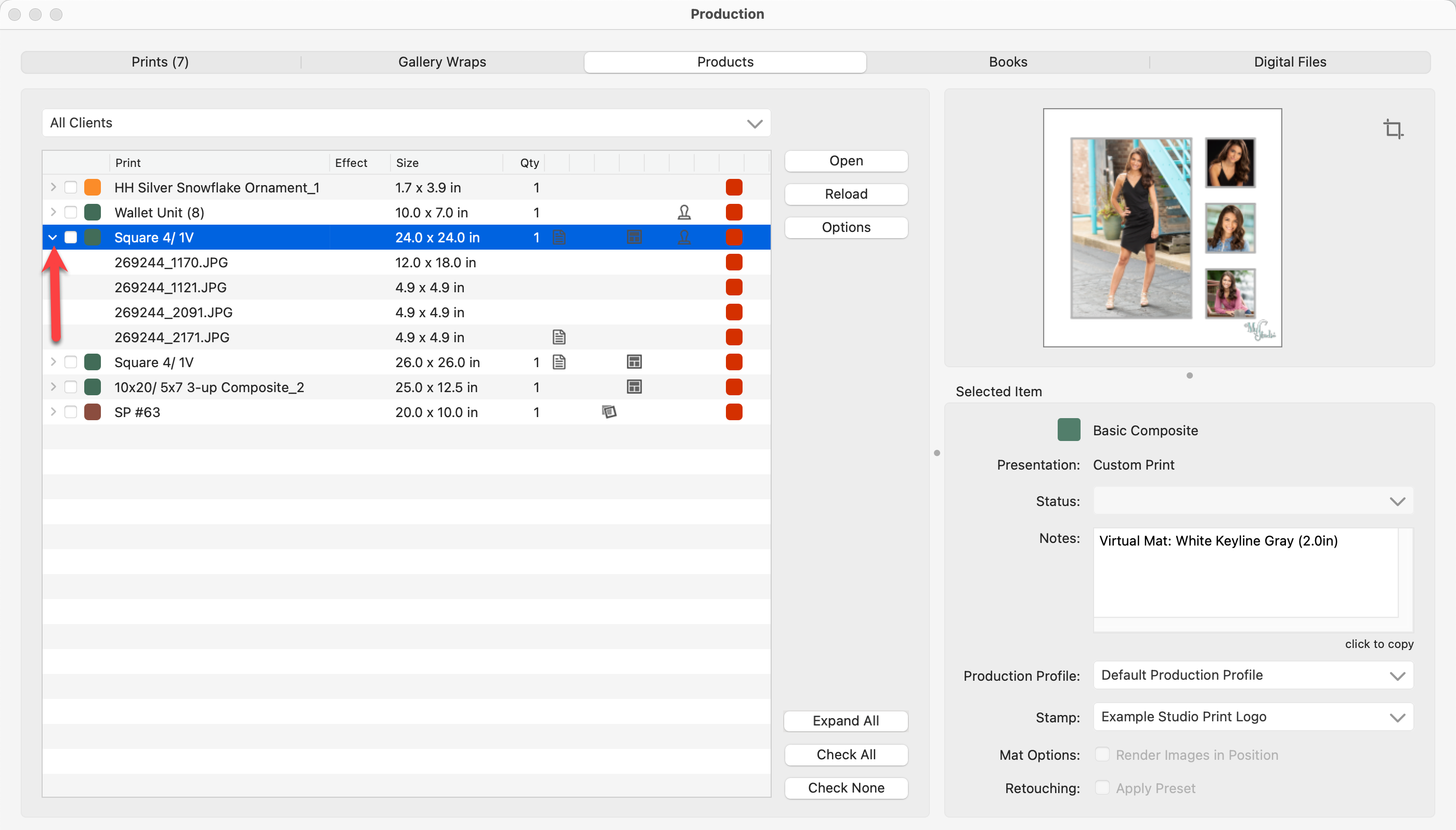 The interface for managing Products, Books, Wall Groupings, and Digital Files operates similarly to that for Prints and Gallery Wraps. The key difference lies in accessing the images within each product type: you must click on the drop-down arrow located on the left side of the line item to expand and reveal the contained images. Use the Expand All button to reveal all images. Hold down the OptionAlt key while clicking the button to "Collapse All."