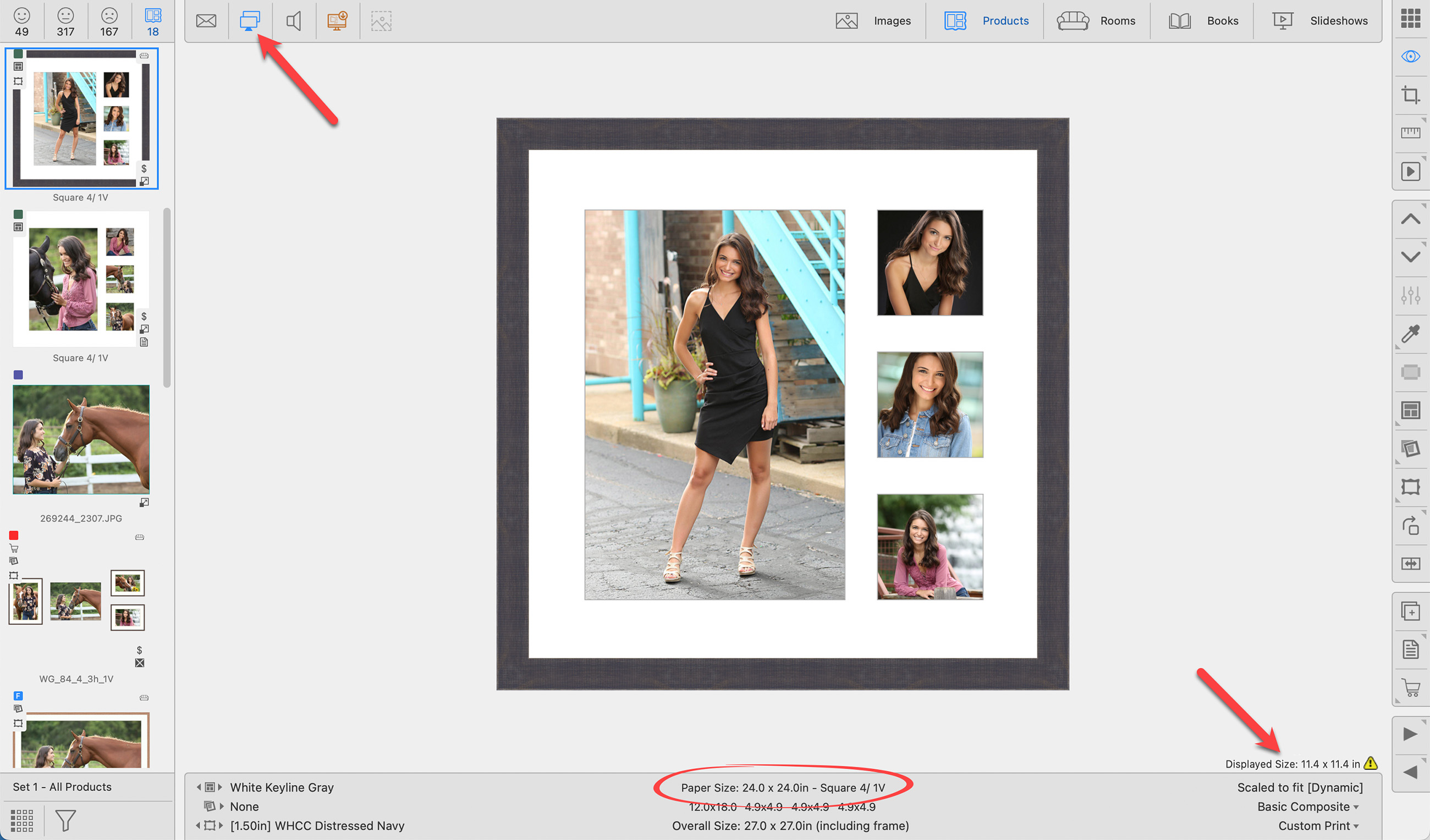 to activate Presentation Mode. - The Client can now see the product being displayed at Actual Size. Because the DELL Monitor is not large enough to display a 24" x 24" paper size, ProSelect will display it at the largest size possible given the constraints of the DELL monitor's size. In this case, 11.4" x 11.4". The "Displayed Size" only appears on the Main ProSelect screen.