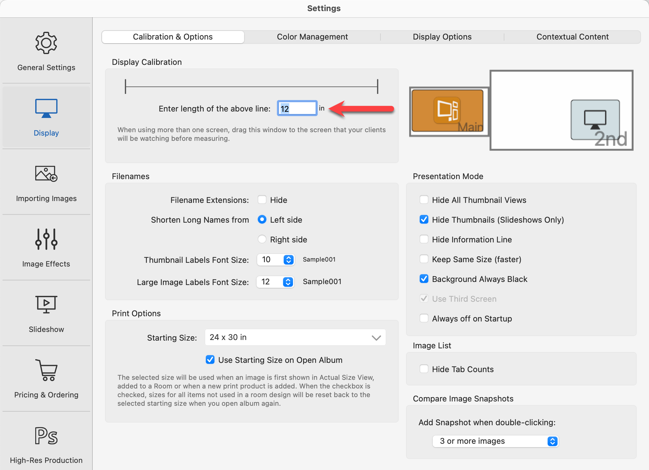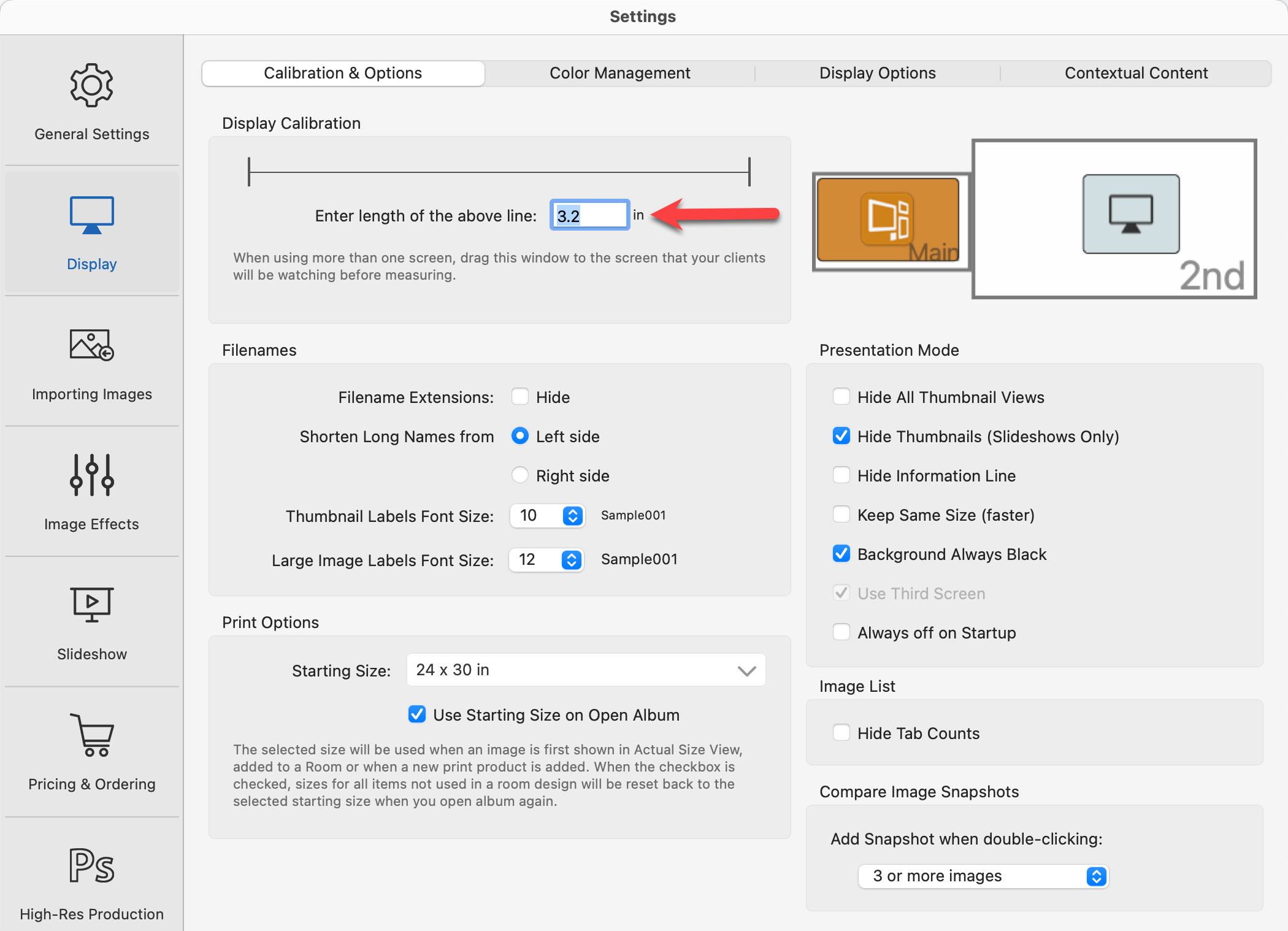 When Working with Images, Actual Size view will show the selected image scaled to its actual size in the Display Area. It's particularly effective if you have a digital projector or a large screen display, this is useful for showing your clients how big the images will be on their wall. To display images and product sizes correctly, you must first set your Display Calibration. This is done in your Settings. Go to the top menu, ProSelectEdit > Settings > Display > Calibration & Options.