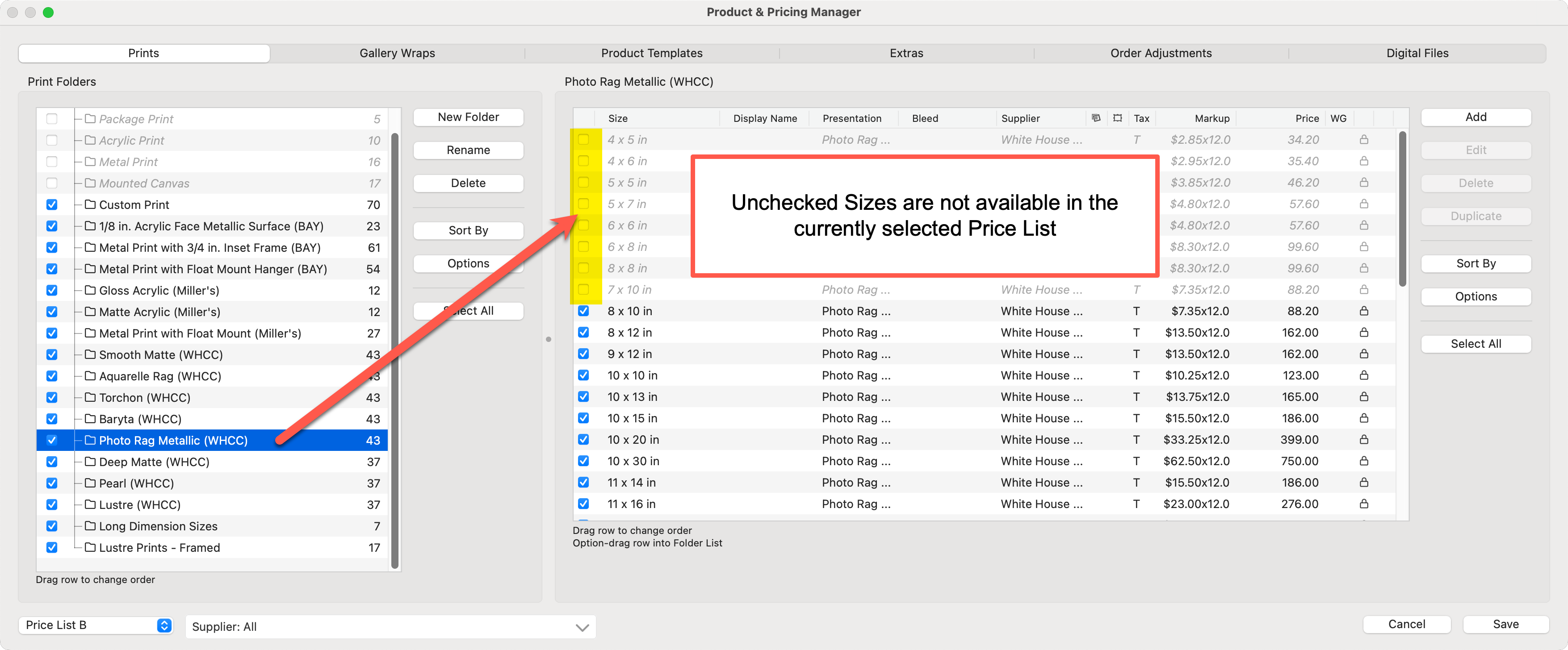 - The checkbox beside each size controls whether that size is available in the selected price list.