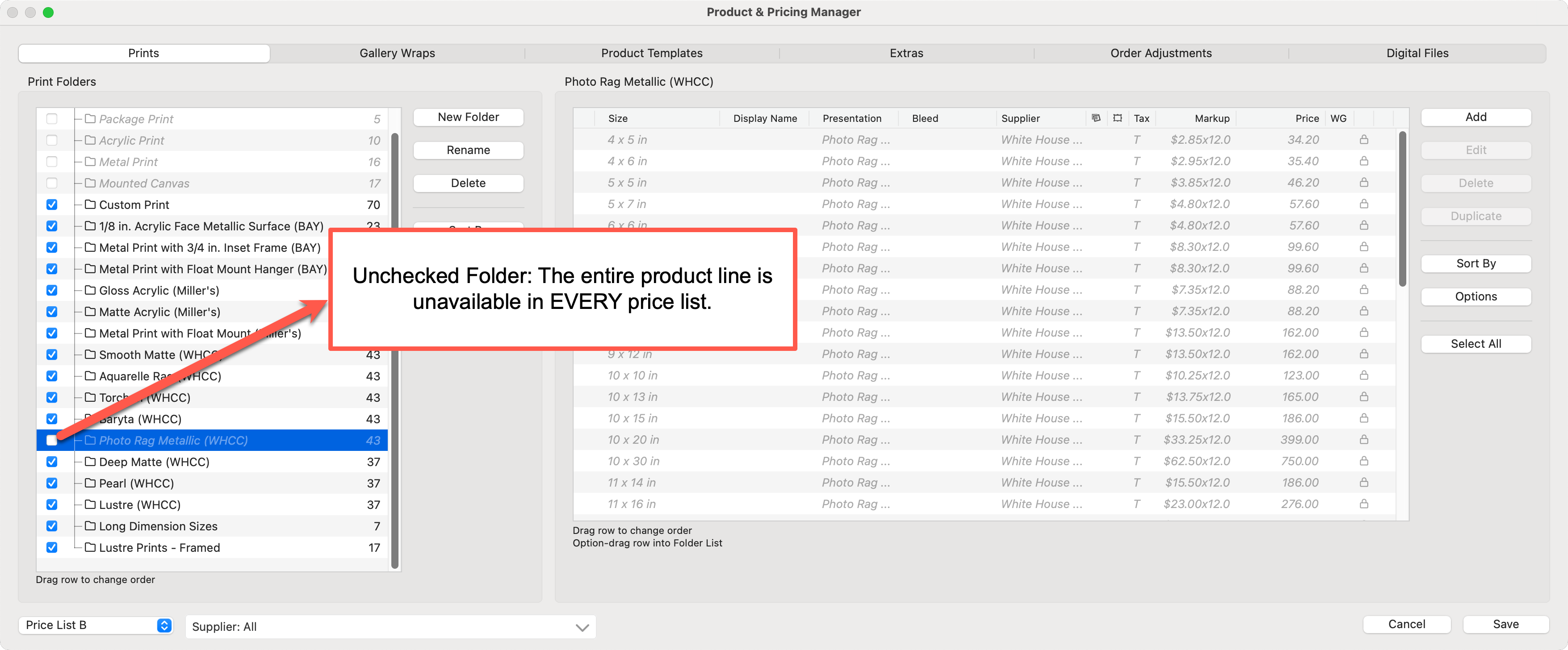 - That folder of products will not be available in any price list. Turning off a folder turns the product off globally on your system.