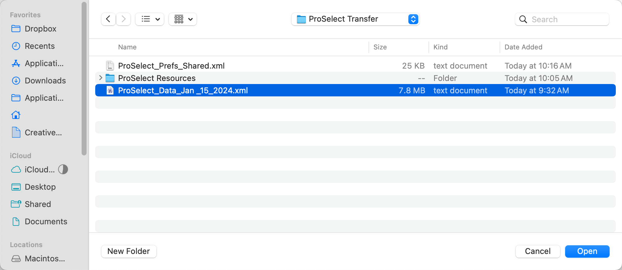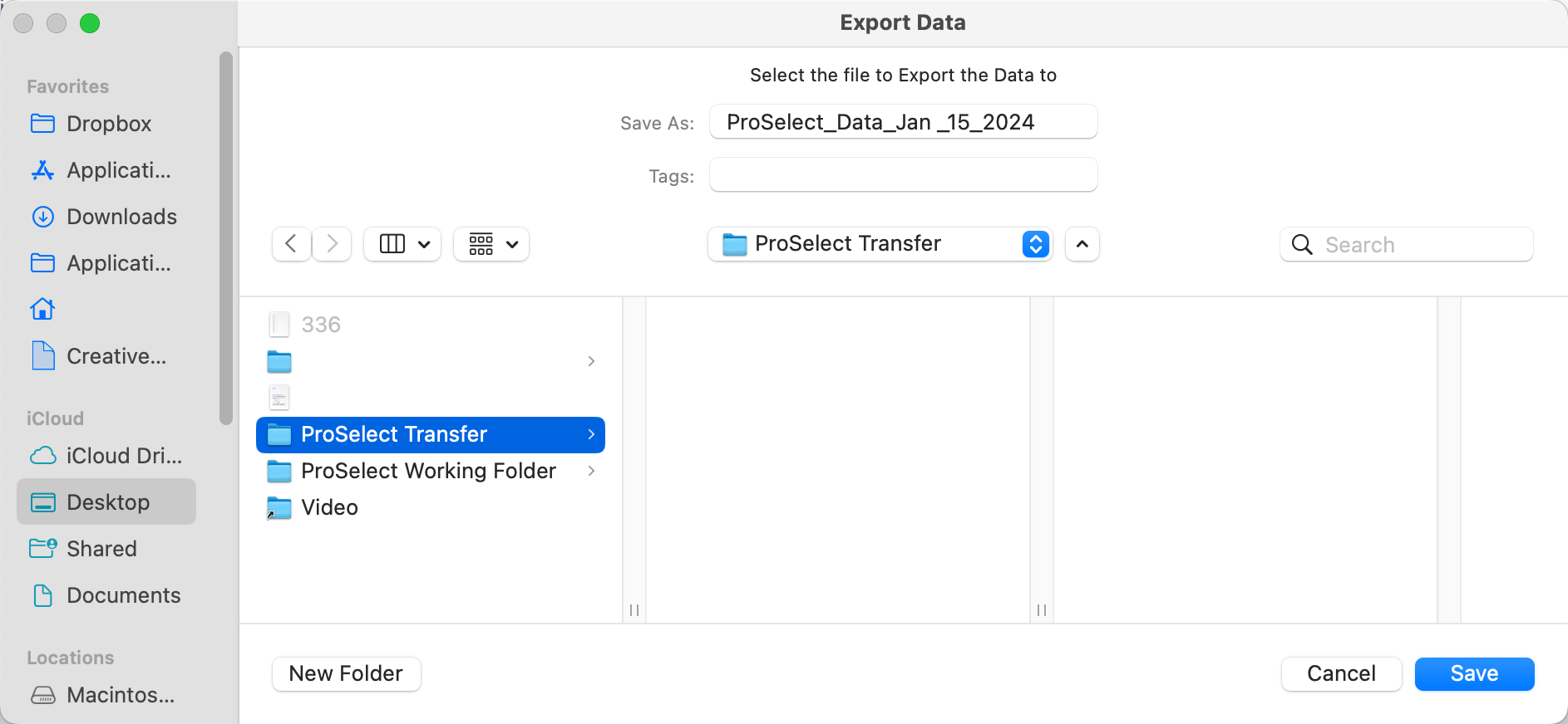 - Save the data file (.xml) to your computer (in this case, a folder called "ProSelect Transfer") or an external drive.