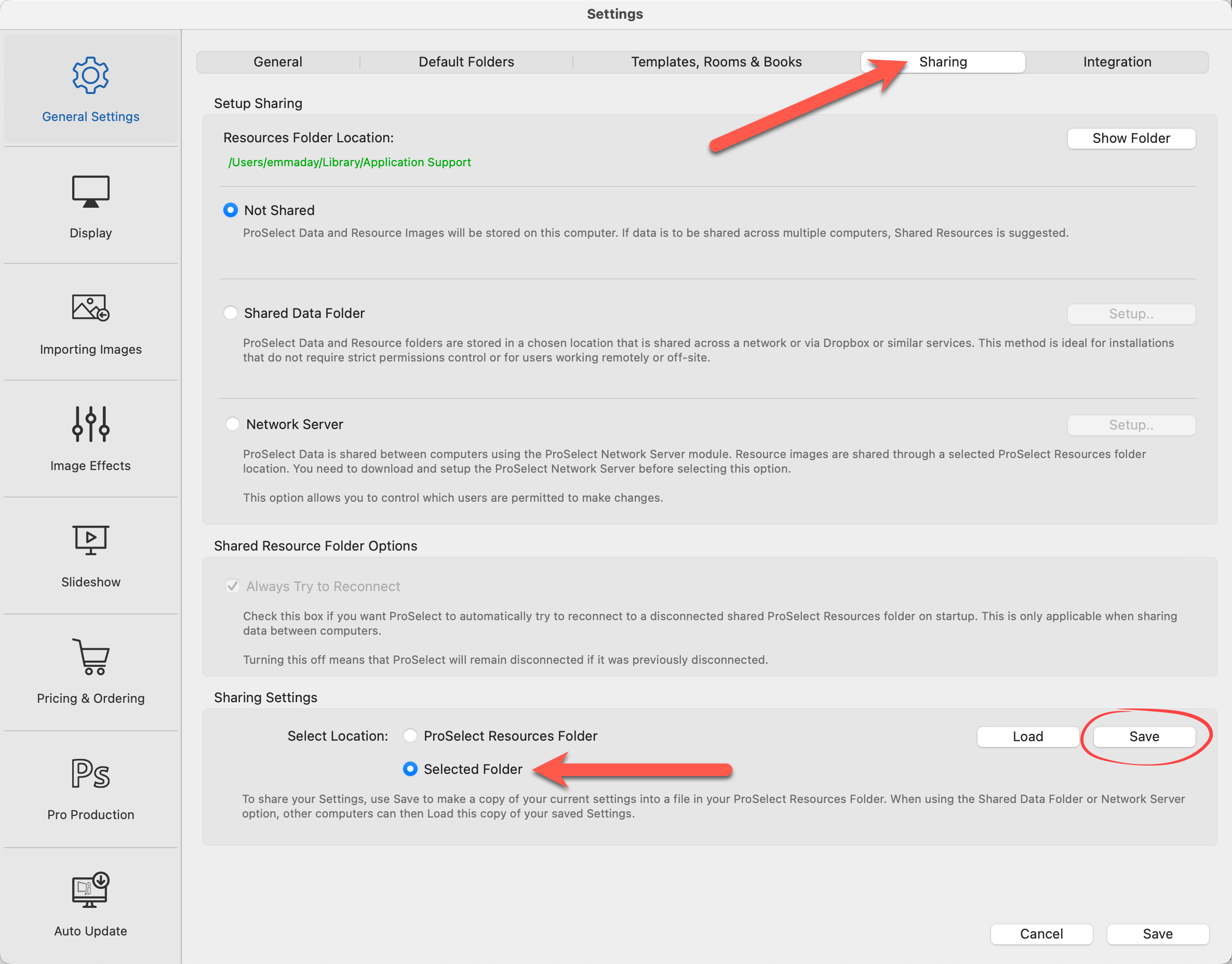 - Open Settings: Go to the top menu, ProSelectEdit > Settings > General Settings > Sharing.