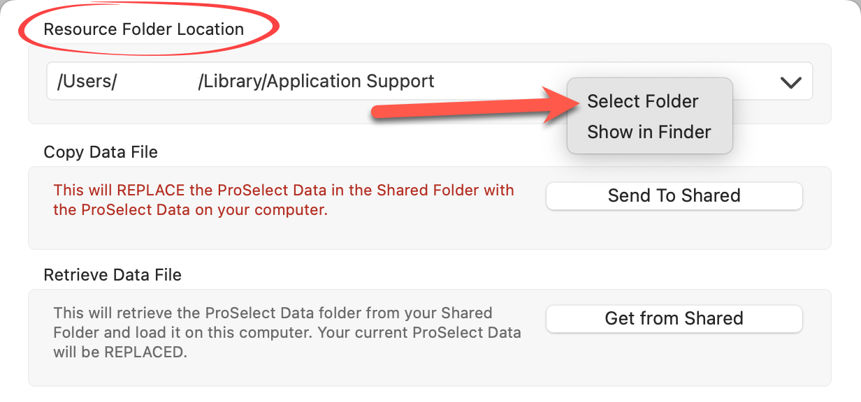 - Setting Up Resource Folder Sharing: To sync your ProSelect data across multiple locations, place the ProSelect Resources folder inside your Dropbox folder. Click on Setup Shared Folder for step-by-step instructions. When you are asked to select a location for the ProSelect Resources folder, navigate and select the ProSelect Resources folder within your Dropbox.