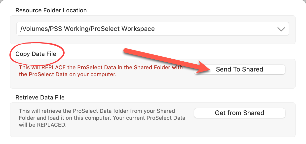 - Under the Copy Data File section, select "Send to Shared" to copy your current ProSelectData.xml file into the new resources folder in the shared location. A confirmation will popup.