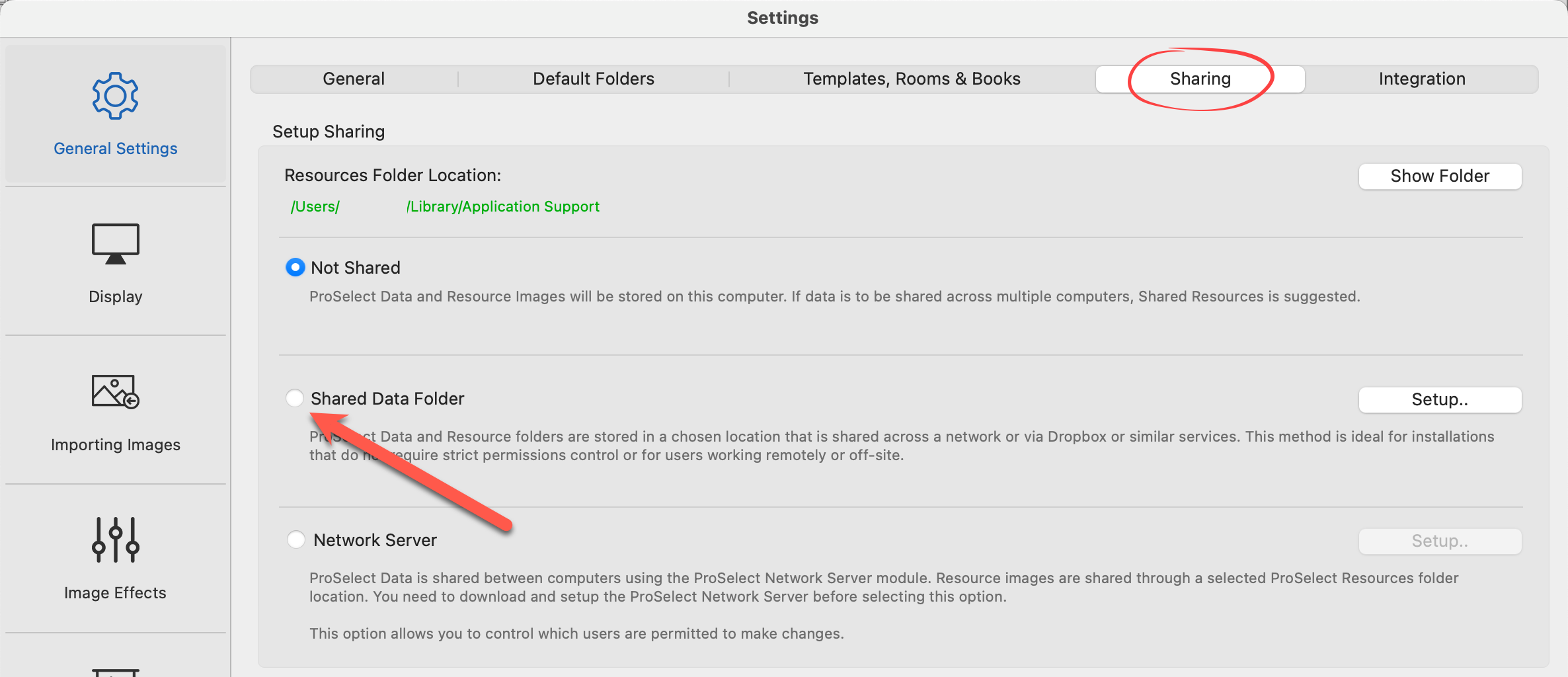 Caution - Preventing Data LossThe Shared Folder option is suitable for studios where users can coordinate their updates to avoid conflicts. If two users open ProSelect simultaneously, both will access the same data file. If one user saves changes, the other won't see these updates until they restart ProSelect or manually update from the shared location. If the second user saves changes before updating their data, it could overwrite and erase the first user's modifications. Coordination is essential to prevent data loss.
