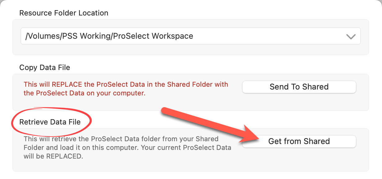 - Select "Get from Shared" under the Retrieve Data File section. This action points the computer to use the shared resources and updates the local low-resolution resources and the ProSelectData.xml file.