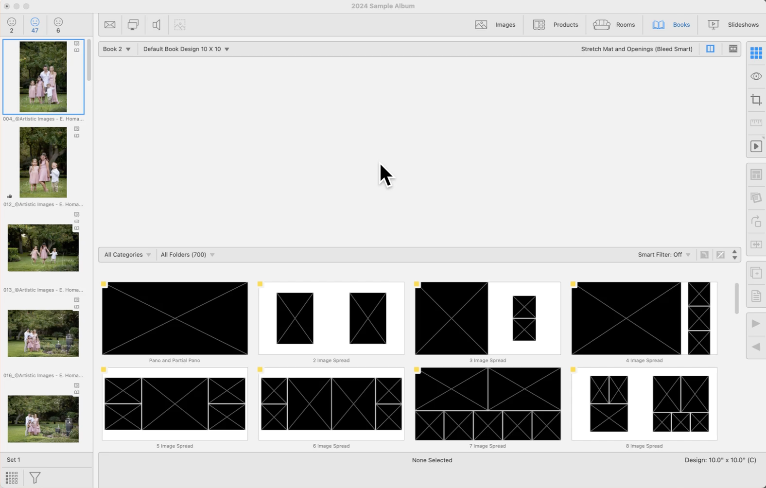 Allows for the rapid creation of a book by dropping images onto a desired template below the bar, automatically generating new pages with the dropped images until all are utilized. The same template must be used for each page. For instance, dropping 10 images onto a template with one opening results in 10 individual page layouts, each containing one of the images. In the example below, 24 images are selected and dropped into a 3 image opening spread.