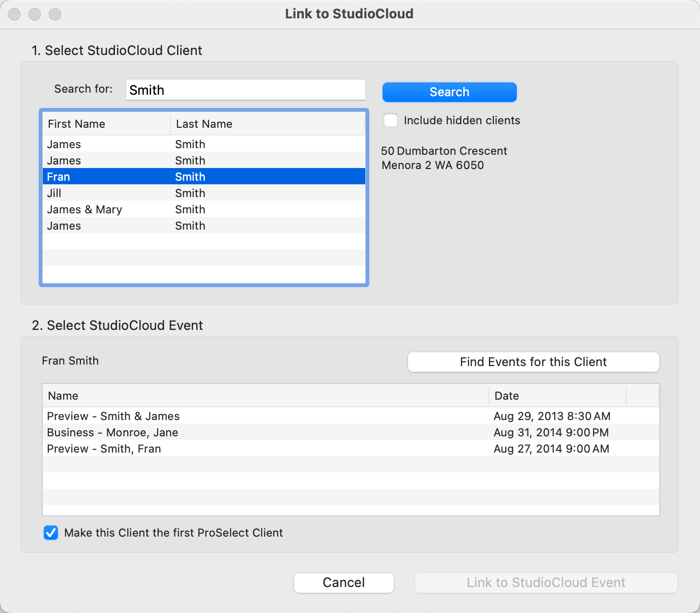 - Because you are linking to a StudioCloud event that must already be tied to a client, this client-event connection must first exist in StudioCloud before you can link it in ProSelect.