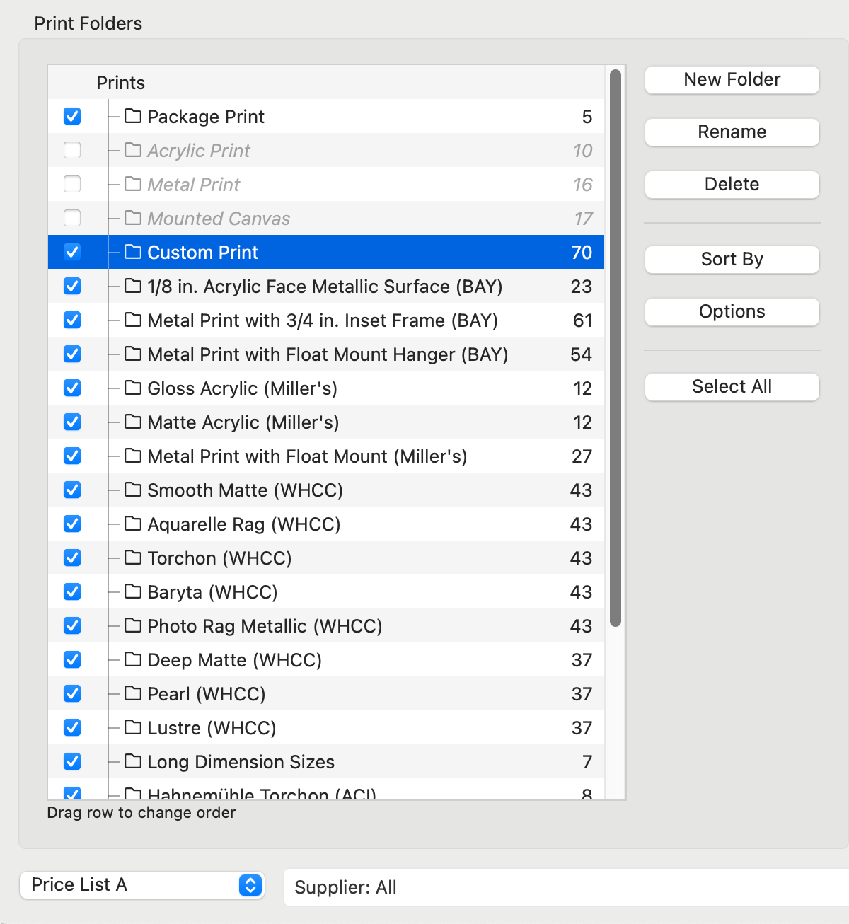 The checkbox on the left-hand side indicates that the print folders are "turned on" and available in the currently selected price list. Uncheck any folders you do not wish to use.- To add a new folder, click the New Folder button.