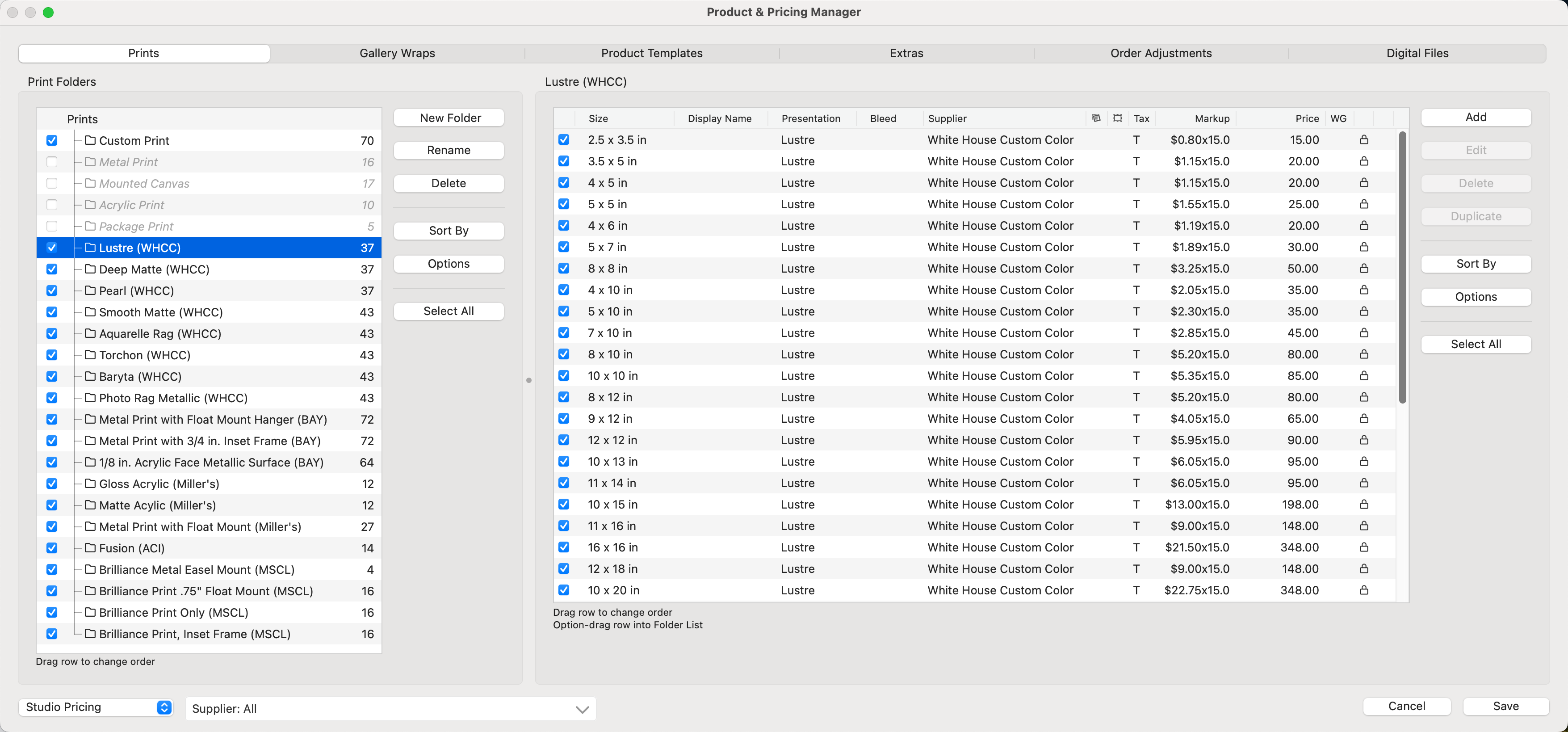 - When you click on a folder, the Print Pricing Panel (on the right) will display any print products already added. If a size is grayed out, it means the product has been previously added but is not active on the current price list. Check the boxes to show/hide a print size.