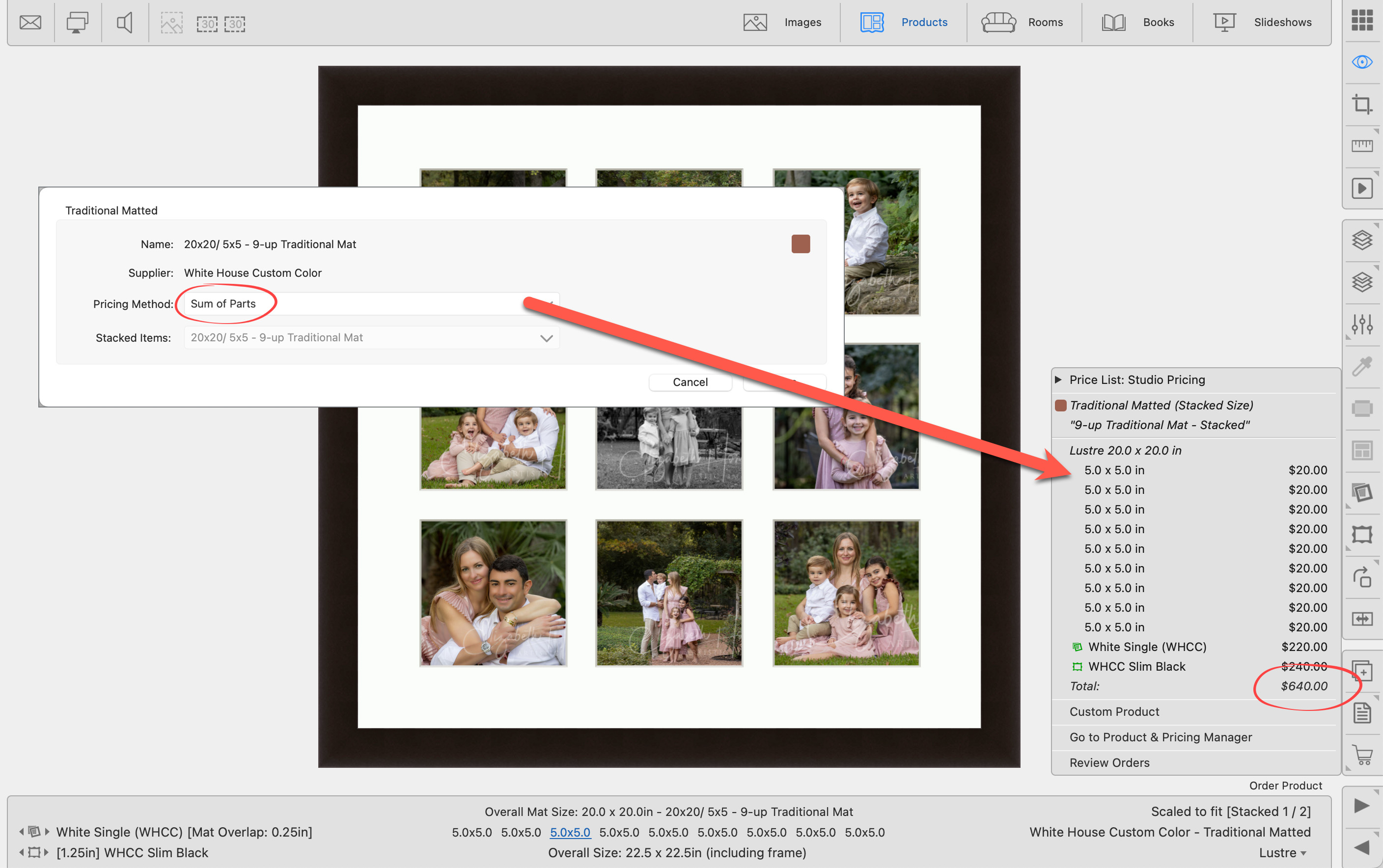 Traditional Matted products now support Sum of Parts pricing, making it easier than ever to price these classic offerings with speed and accuracy. With this new option enabled, ProSelect automatically calculates the total price of a matted product by adding together the individual prices of its components—prints, mats, and frames—based on your existing pricing structure. Whether you're selling from a curated product list or building custom designs on the fly, pricing is instant and always consistent.