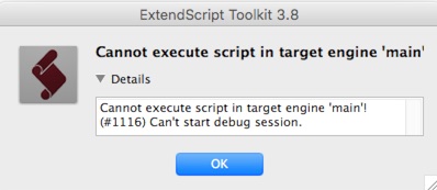 1. If you get the error message shown below when you start running the script in the debugger then see KnowledgeBase Article: Adobe ExtendScript "Cannot Execute Script" error