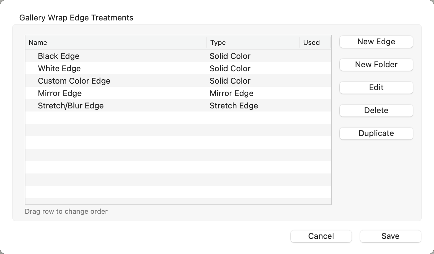 - To add a new Gallery Wrap edge treatment, click the New Edge button on the top-right.