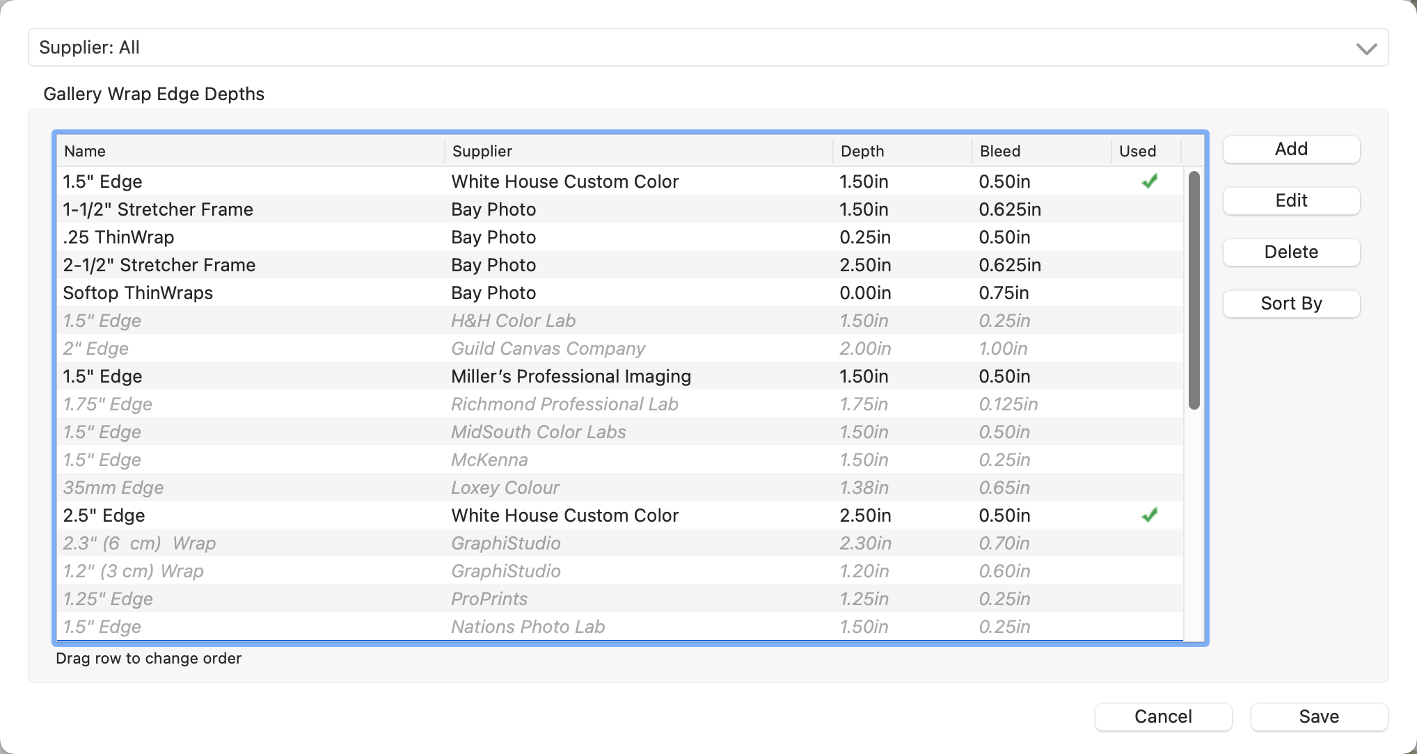ProSelect has an extensive library of Edge Depths based on numerous different Supplier's requirements. You can customize your Gallery Wrap edge depths by going to the top menu, Products > Gallery Wraps > Edge Depths. Note: Edge depths are enabled when the Supplier has been enabled (turned on). If an edge depth appears grayed out, this is because the Supplier has not been "turned on." Go to the top menu, Products > Suppliers to turn them on.