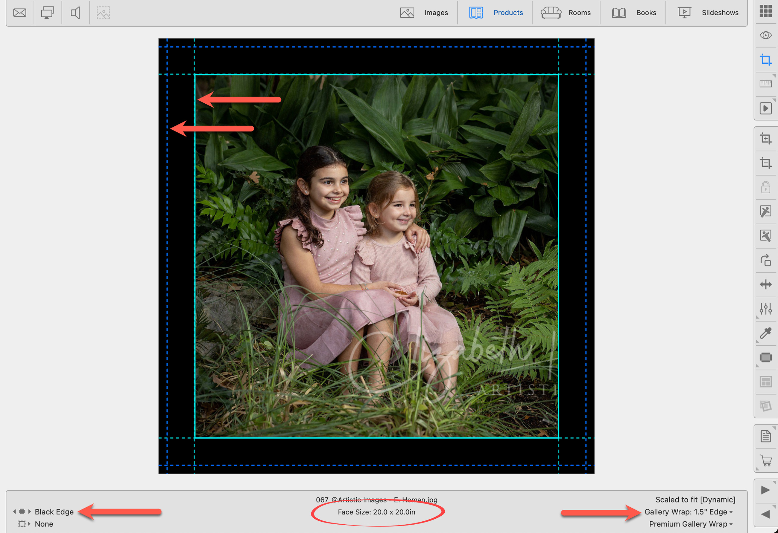 In the following example, you will see a gallery wrap created with a 1.5" edge depth, as shown by the teal line. The bleed is shown as a blue dotted line. This information is visible when in Cropping view.