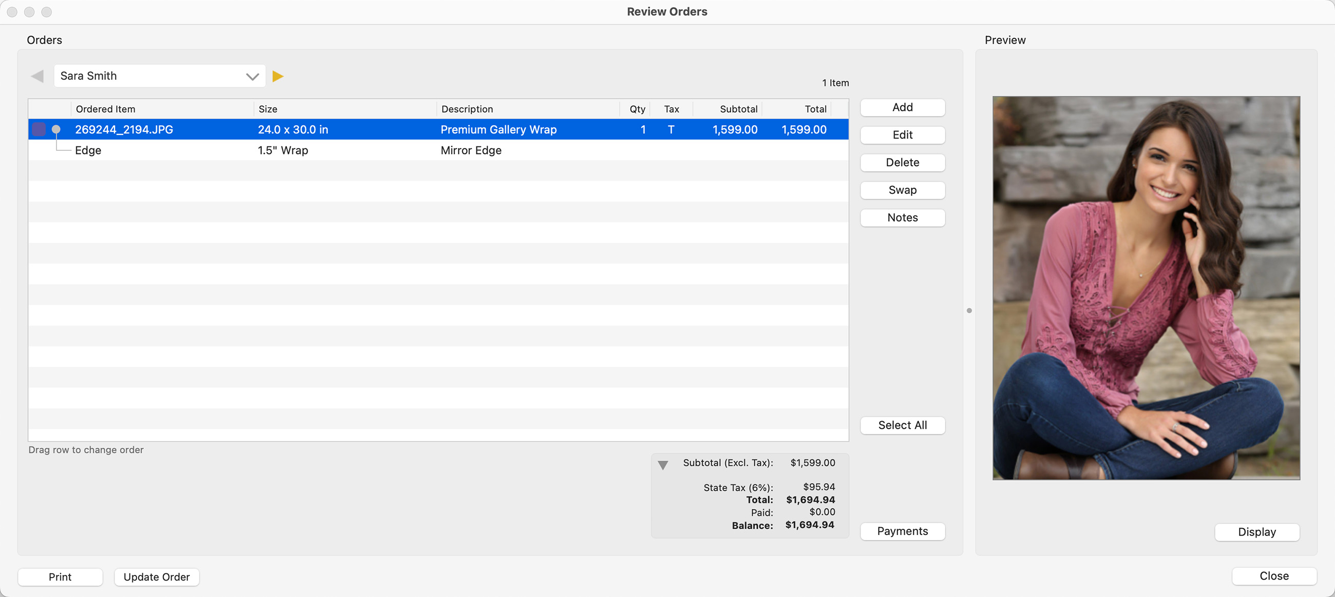 - For example, if you create a 1.5" Wrap, with a Presentation Option of Premium Gallery Wrap, and apply a "Mirror Edge," it will be displayed in the Review Orders window as follows: