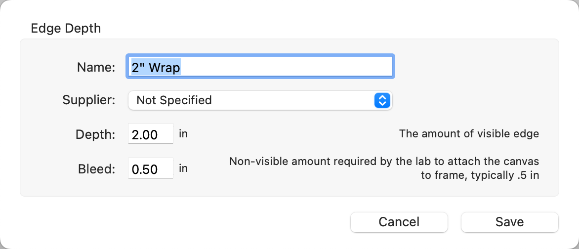 - For a 1.5" Wrap that typically requires 2" of wrap material, enter a Depth of 1.5" and a Bleed of 0.5". Adjust this value based on the requirements of your lab. You can link the Edge Depth to a specific supplier (recommended).