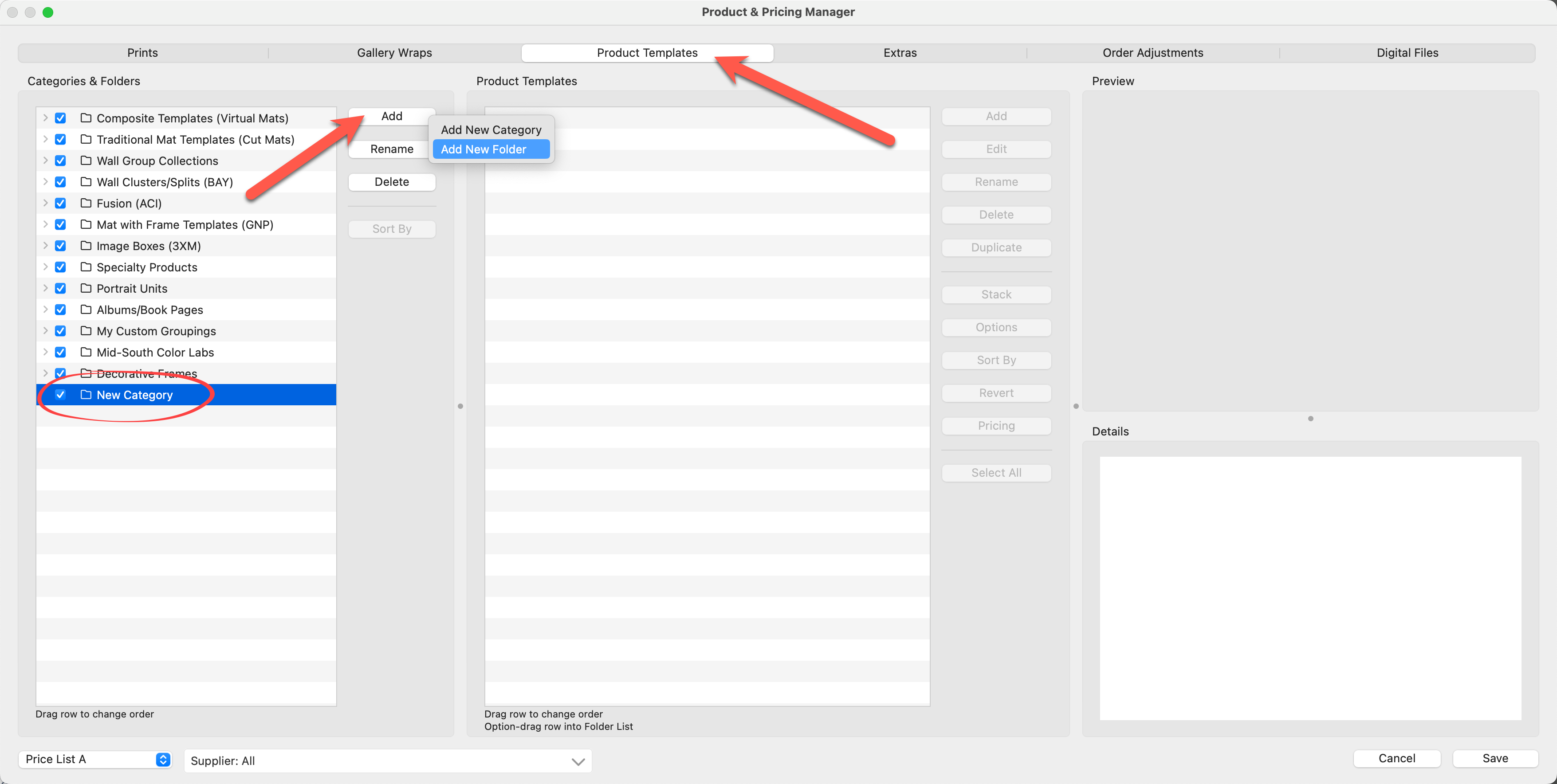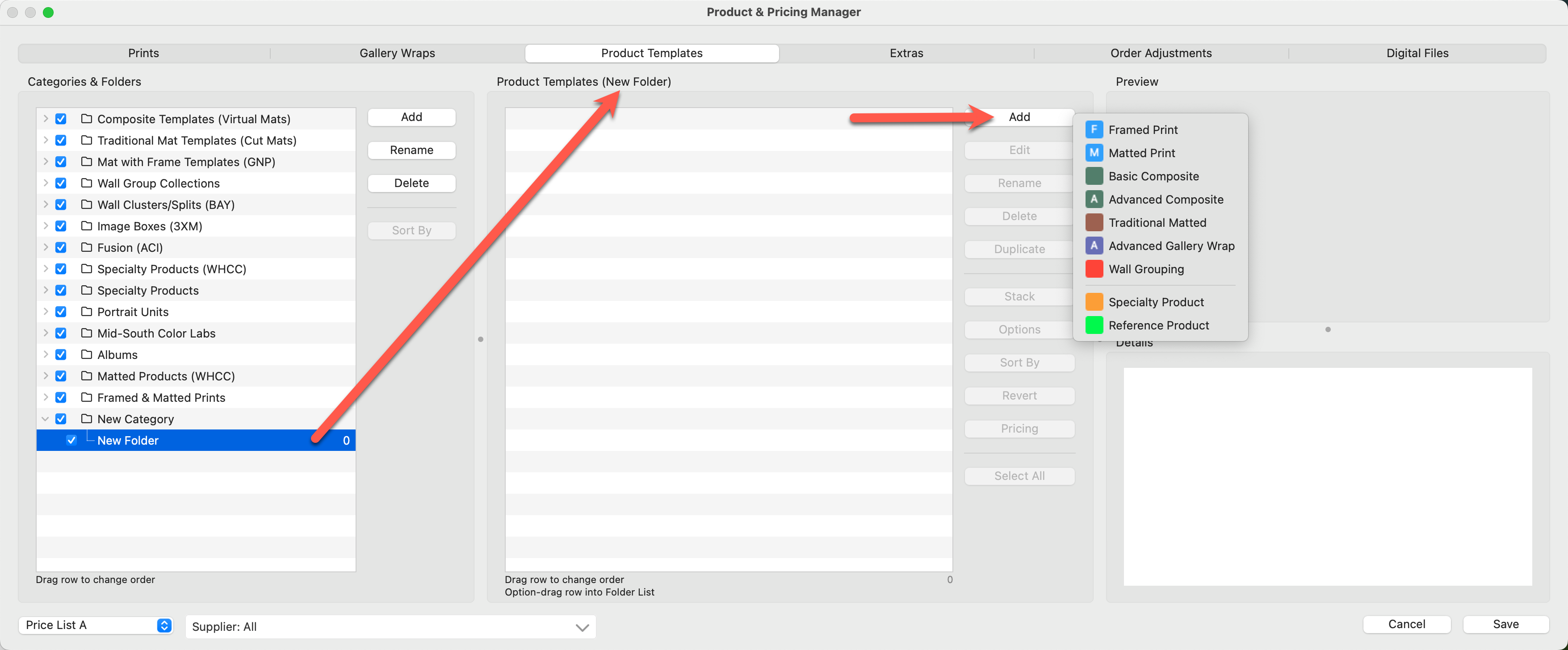 - With a folder selected, move to the next panel (The Product Templates Panel) on the right. All items within your selected folder will appear here.