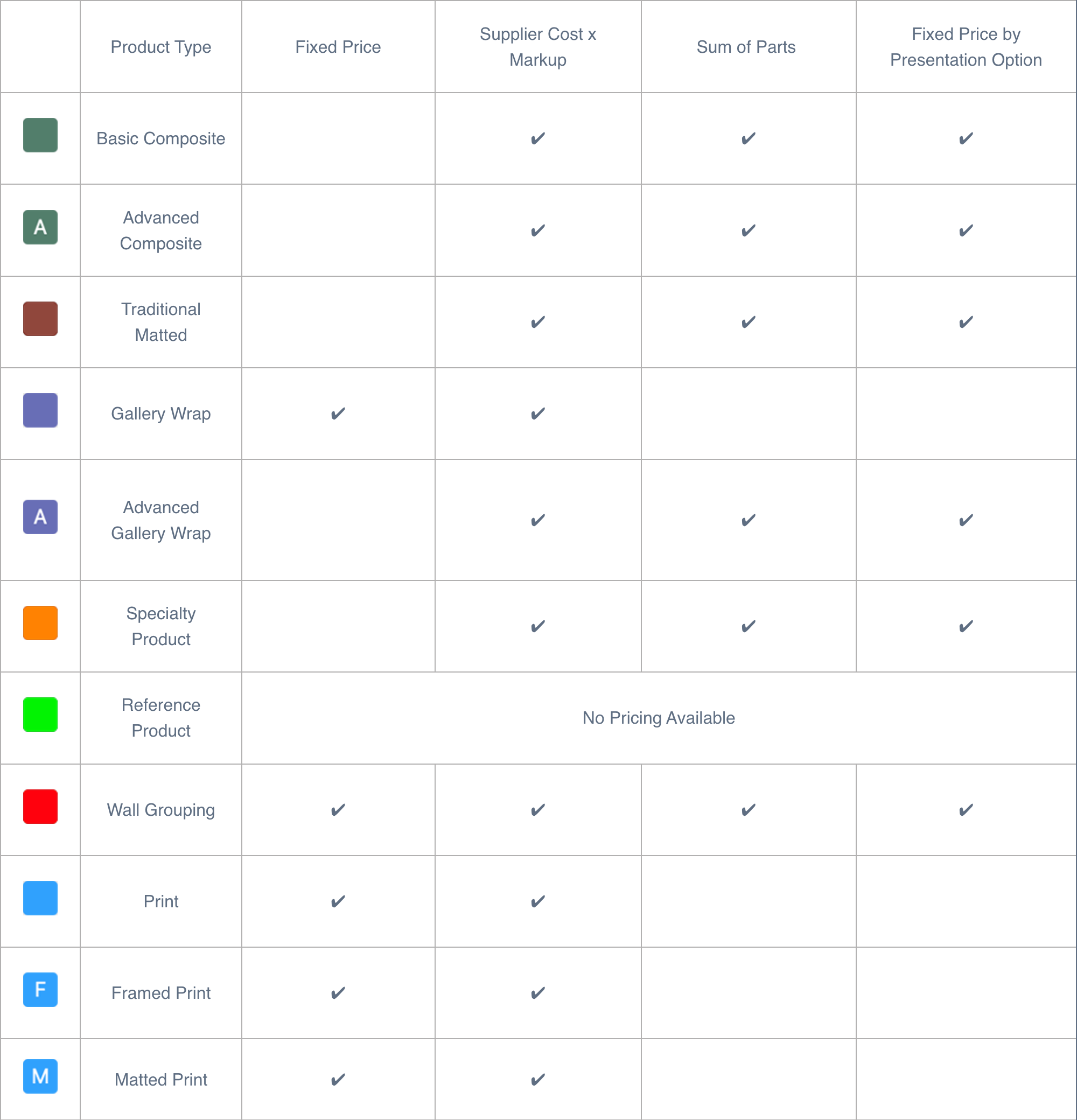Pricing Options Available for Each Product Type