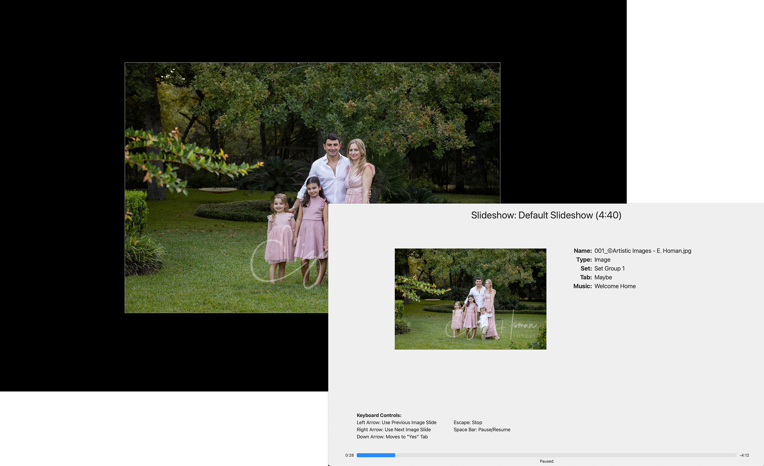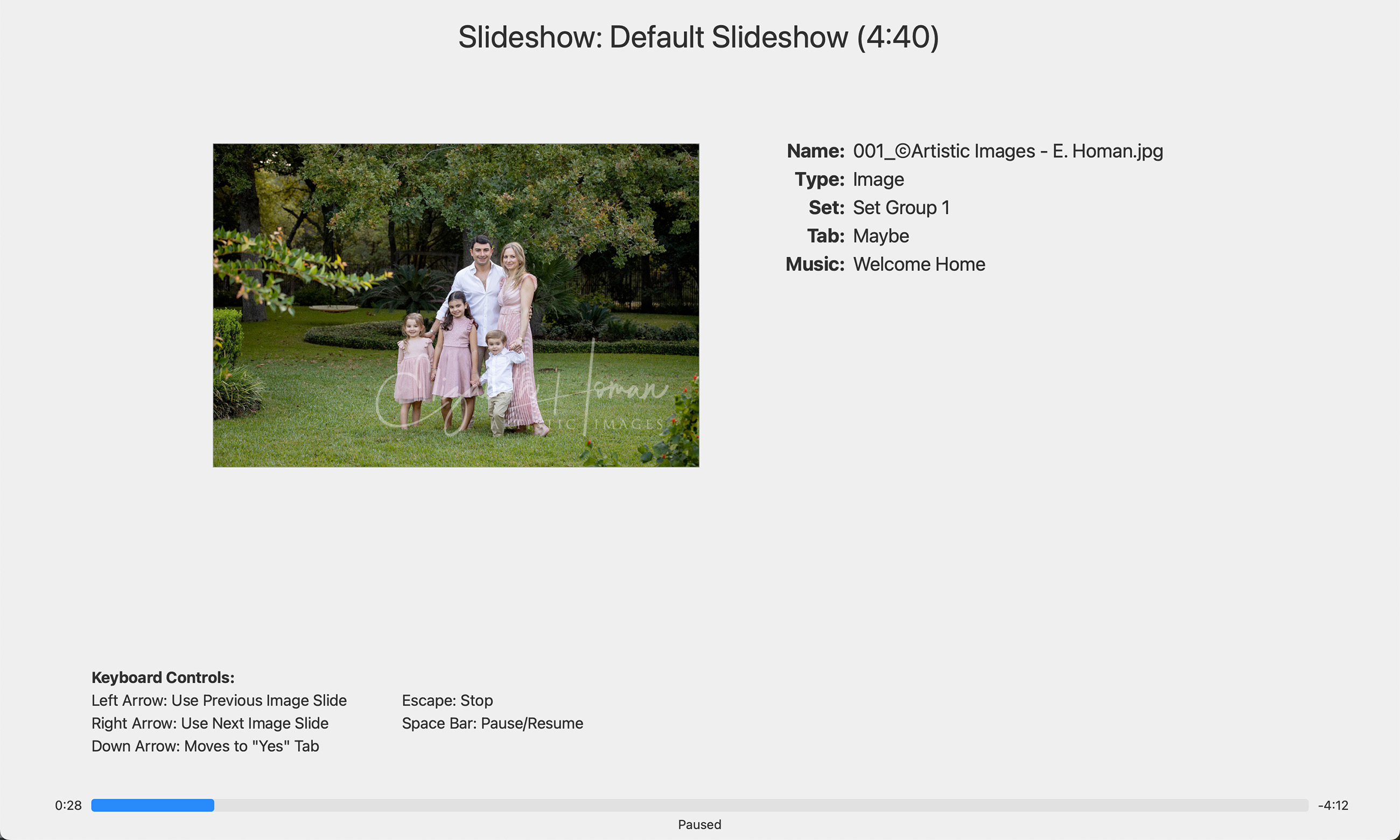 - Keyboard Controls: There is a quick reference to keyboard commands for playing the slideshow.
