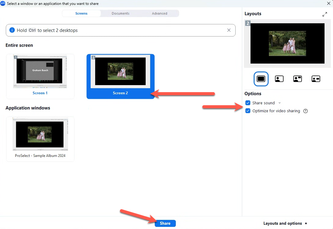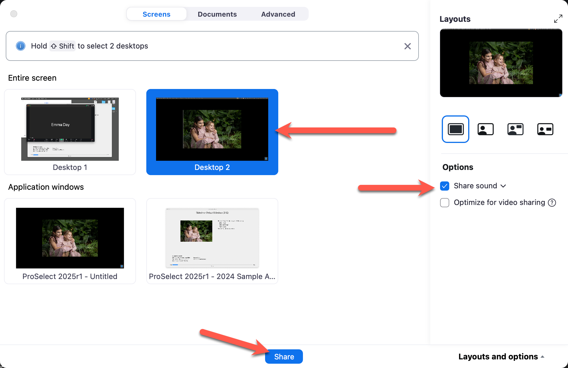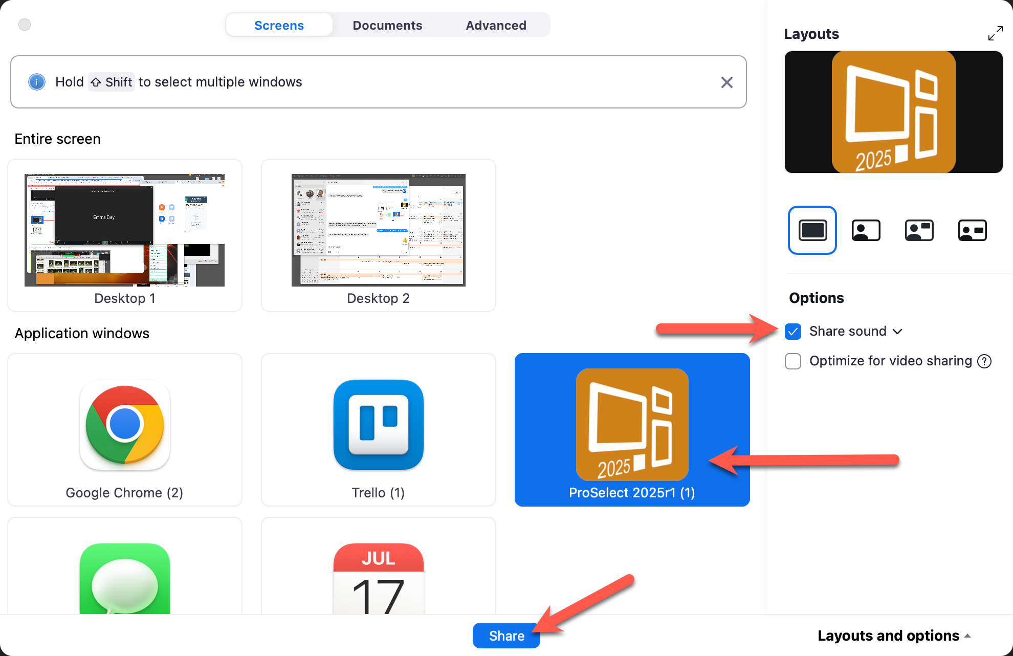 3. Optimize Sharing: In the sharing dialog, check both "Share Sound" and "Optimize for Video Sharing."