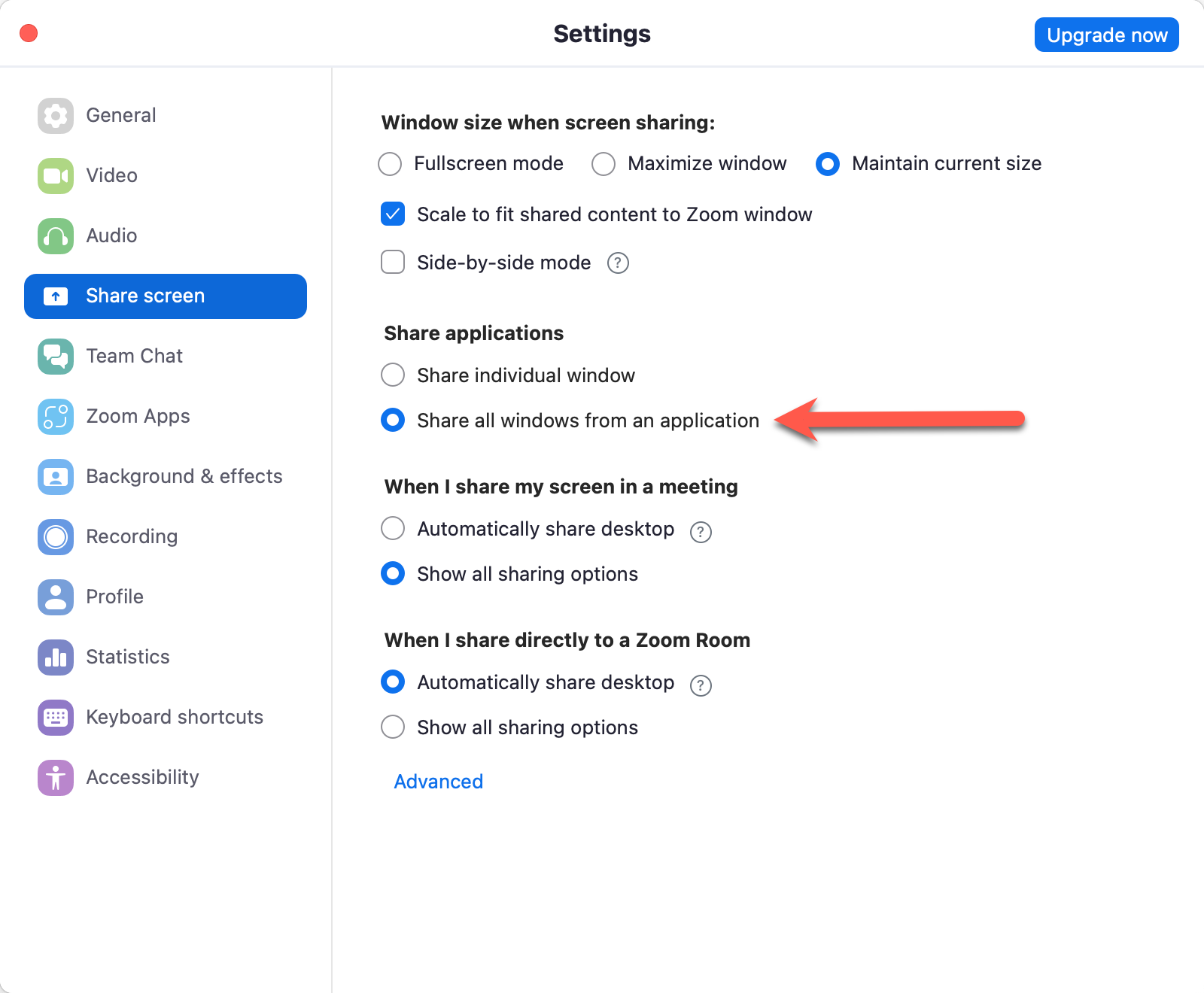 3. Check the "Share all windows from an application" box.  Exit out of Settings.