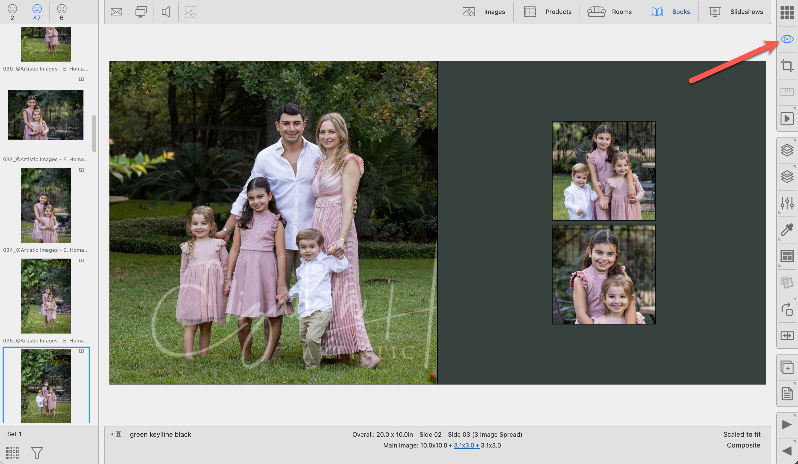 . It is located on the right-hand side under the Thumbnail view button. - With a page selected, go to the top menu, View > Show Book Pages.