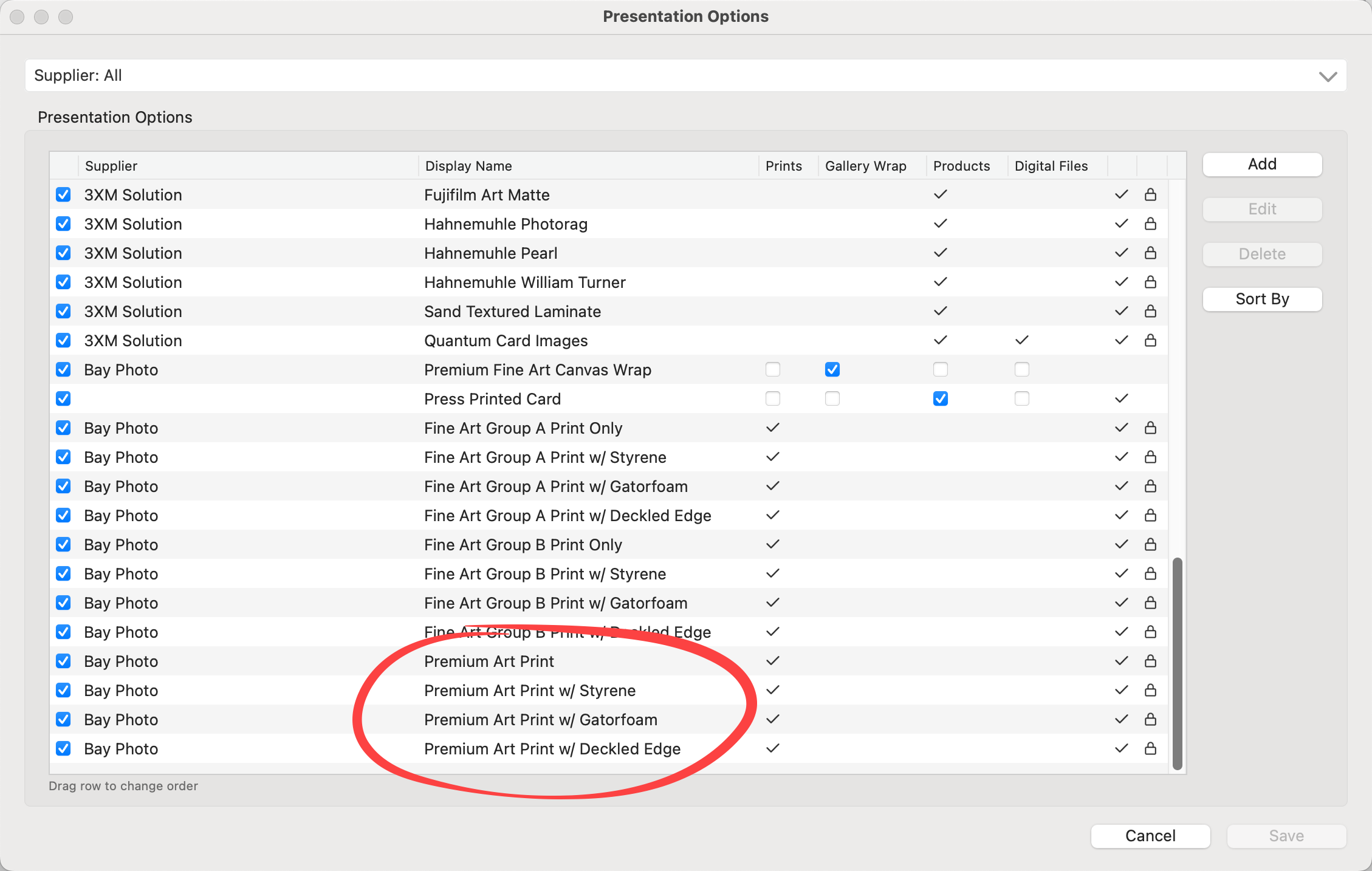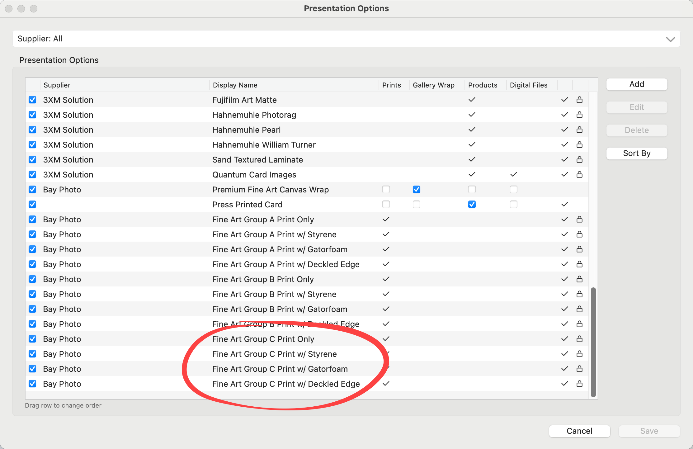 Disabling a supplier will hide all products offered by that supplier throughout ProSelect, including during product selection, design, and ordering processes.  This allows you to simplify your product list and only show the suppliers you actively use.