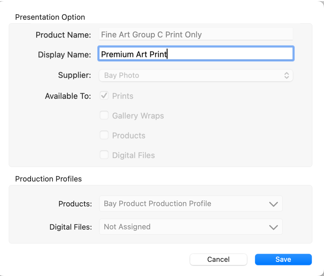 The presentation options assigned in collections reflect the names used in suppliers' catalogs.  ProSelect allows for customizable display names so you can align prints and product names with your studio's branding.  Display Names are created in the Presentation Options dialog.  Once a Display Name is created here, it will be visible everywhere the Presentation Option appears in ProSelect.