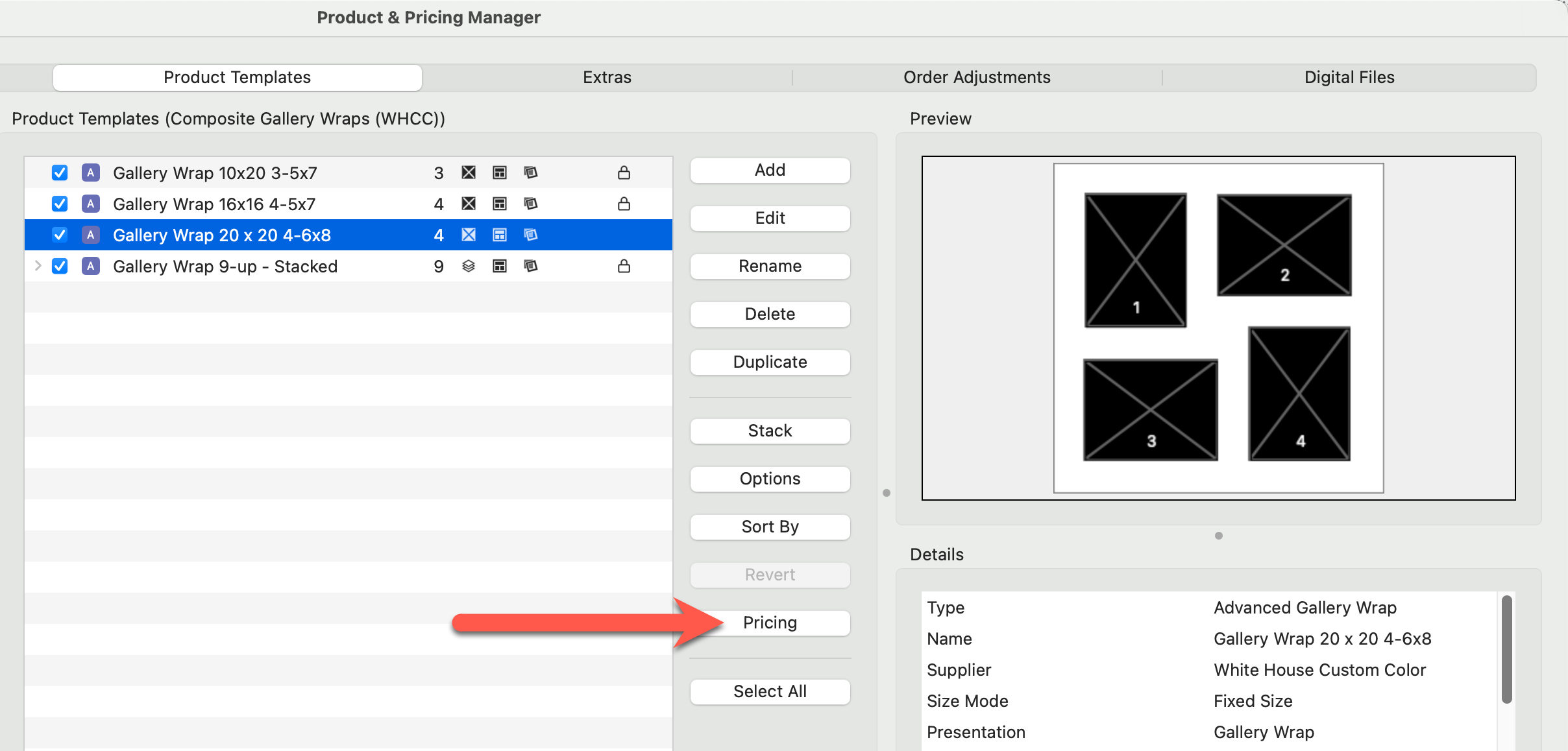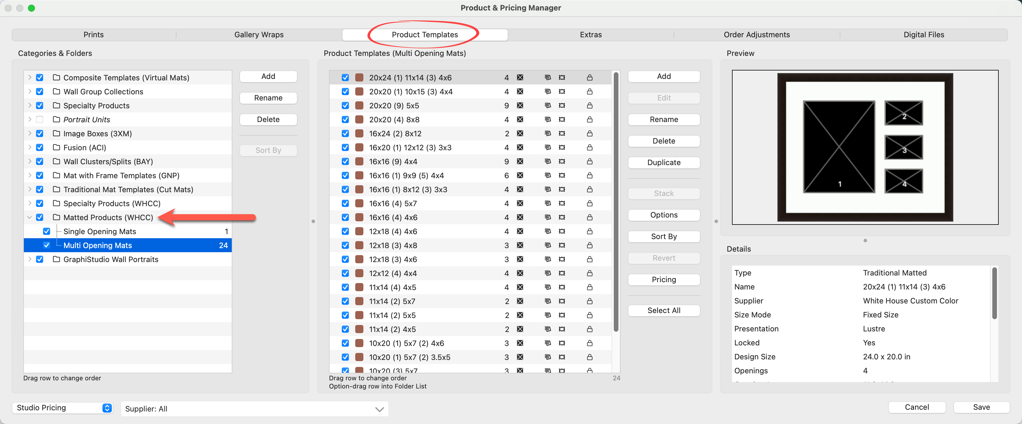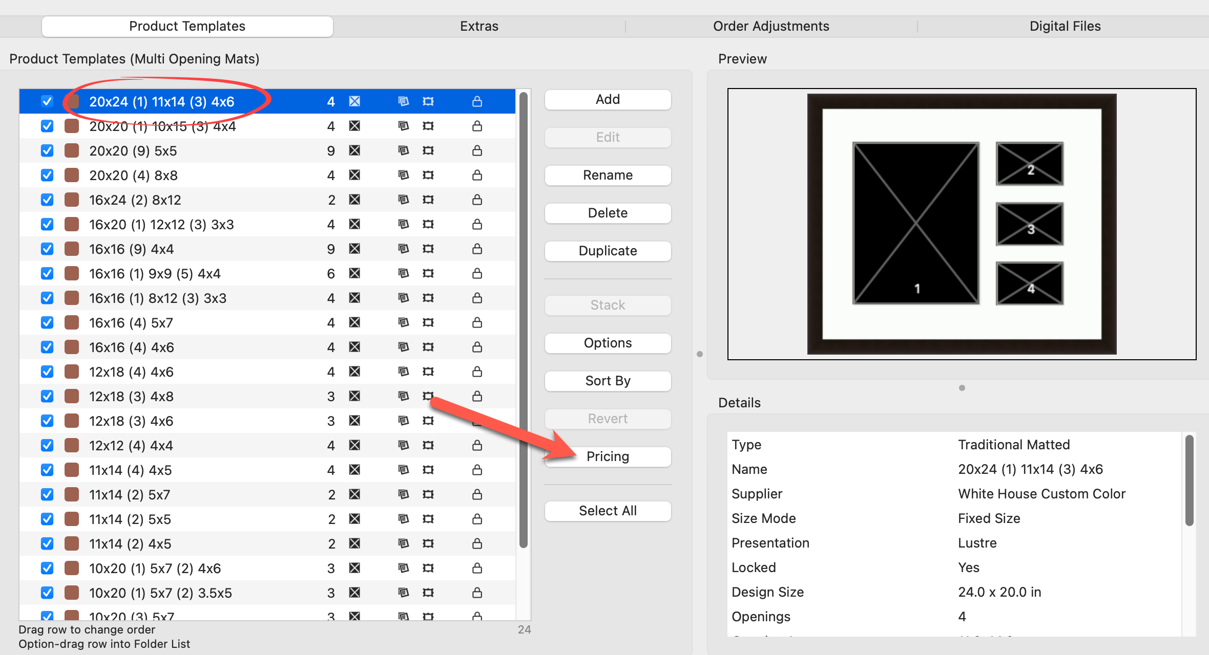 5. We will now price the first product in the "Multi-Opening Mats" folder.  Select the product "20x24 (1) 11x14 (3) 4x6" and click on the Pricing button.