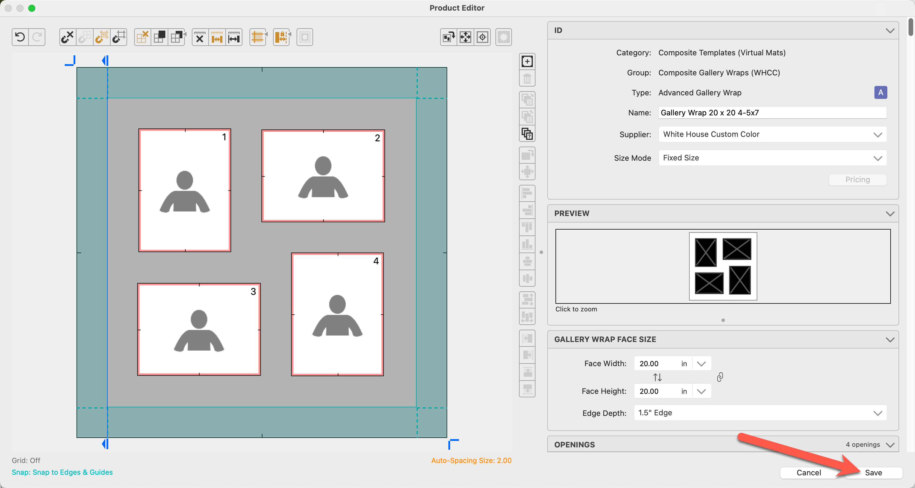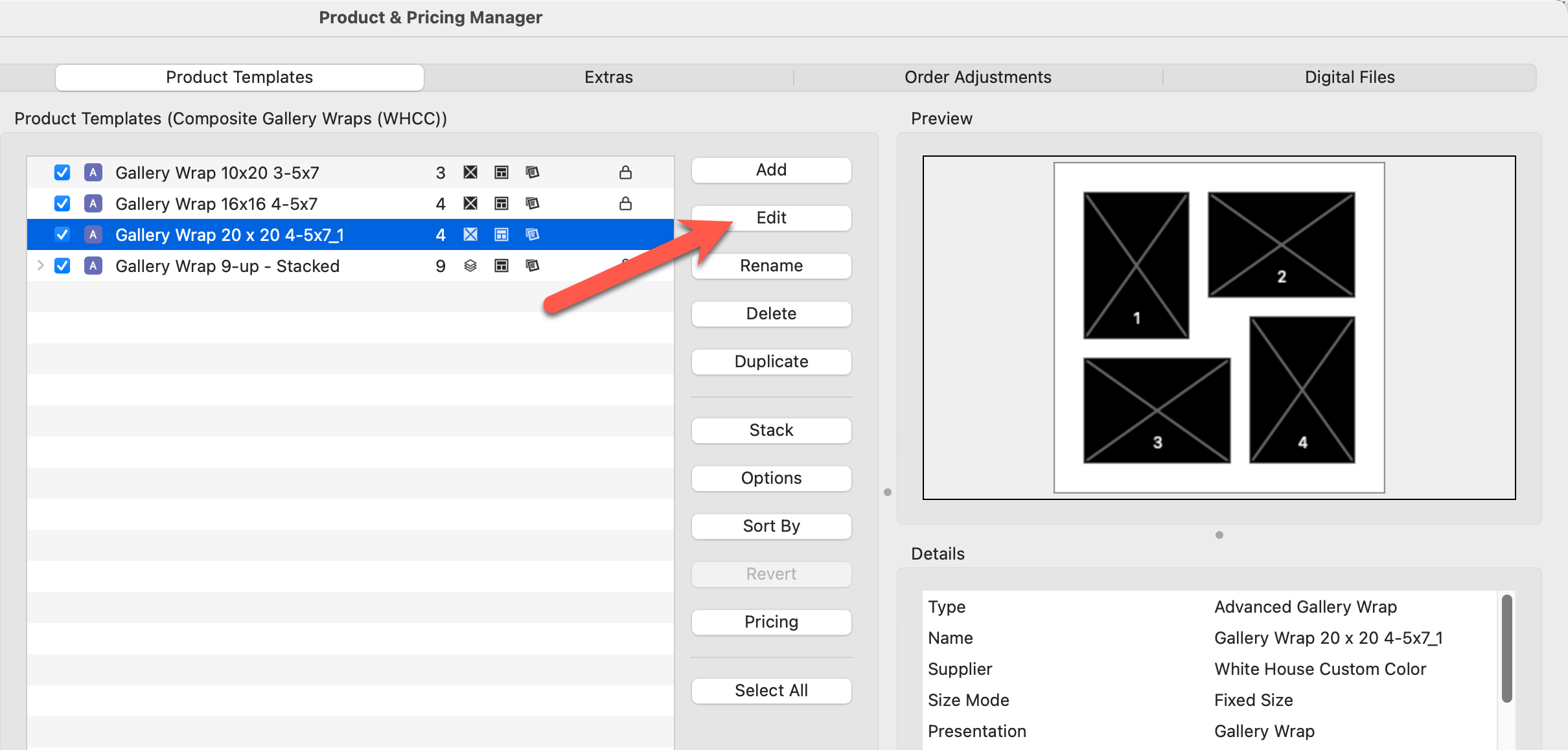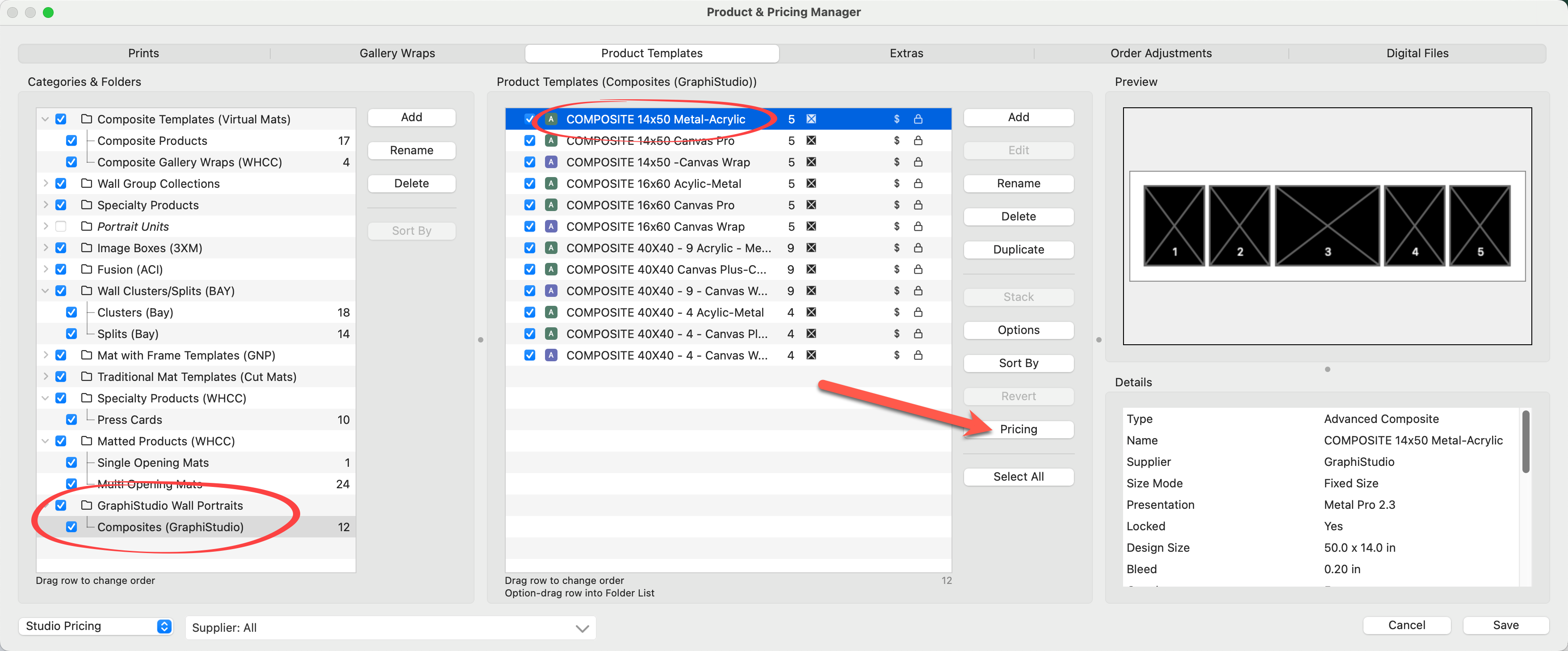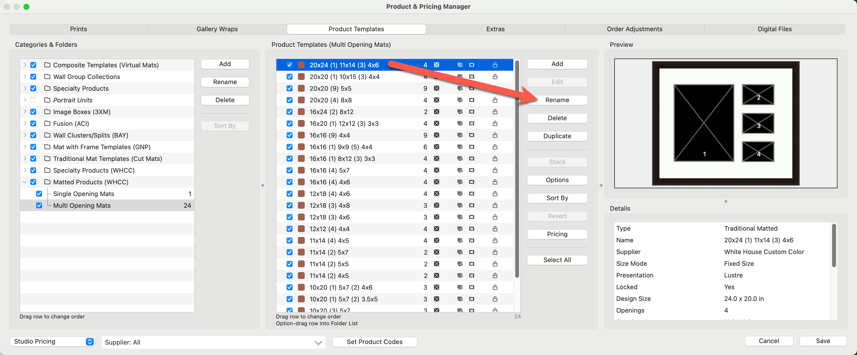 5. We will now price the first product in the "Multi-Opening Mats" folder.  Select the product "20x24 (1) 11x14 (3) 4x6" and click on the Pricing button.