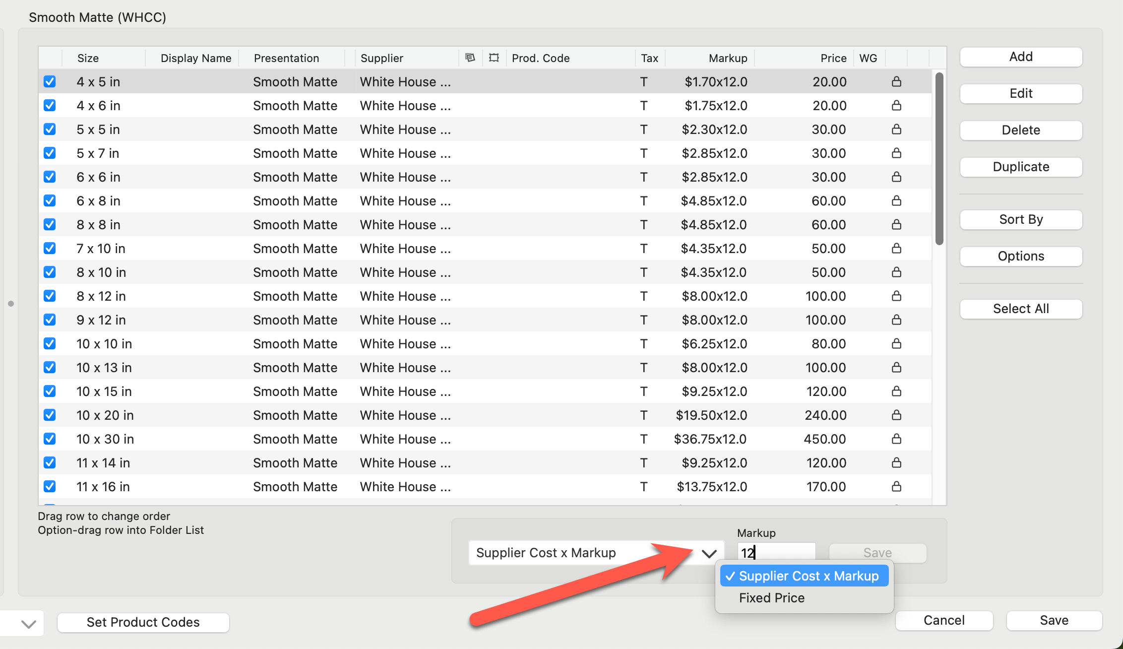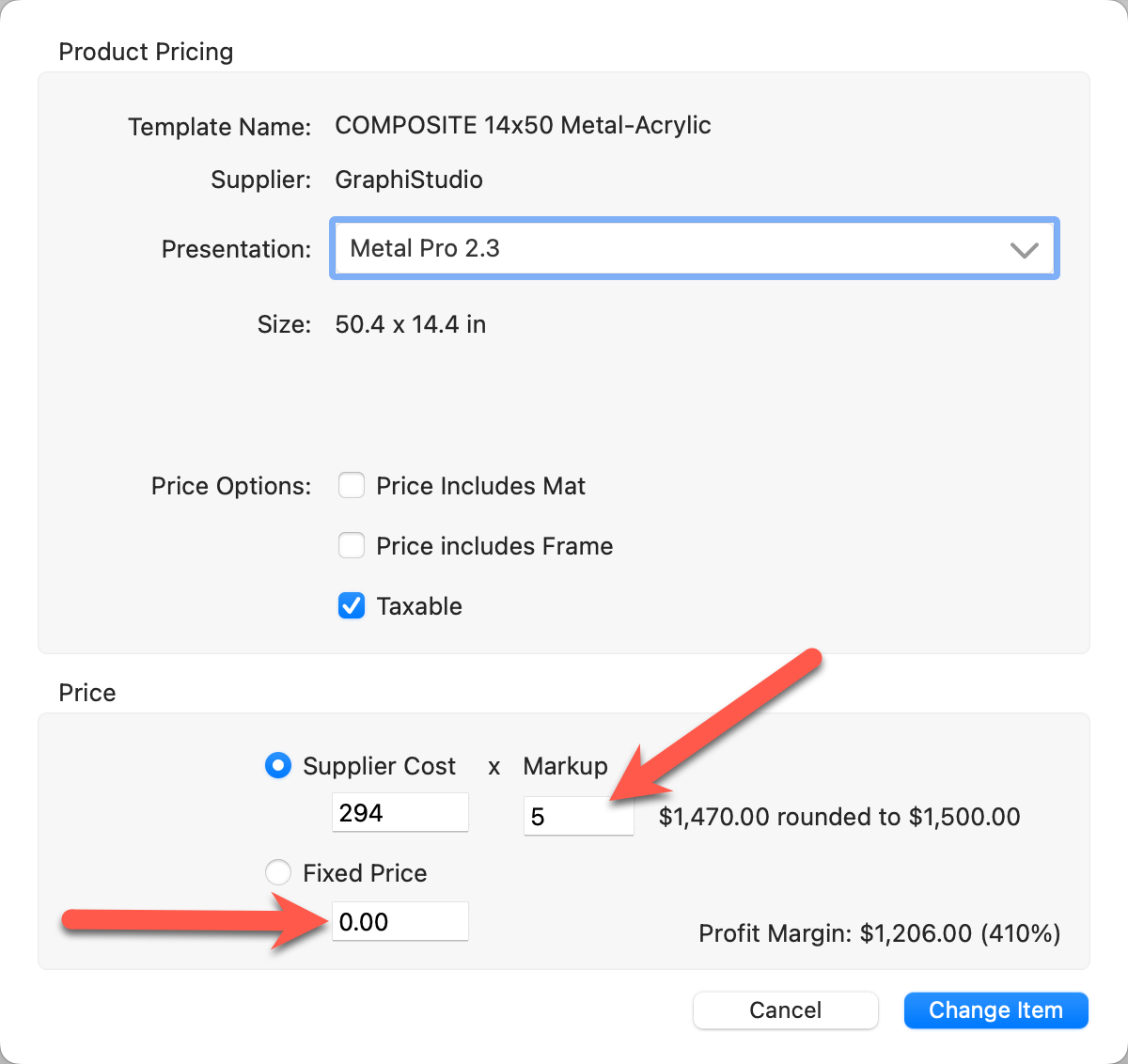 9. If you are using "Supplier Cost x Markup" make a change to the markup value here.  Alternatively, if you prefer "Fixed Price," select that option and type a price into the pricing box.