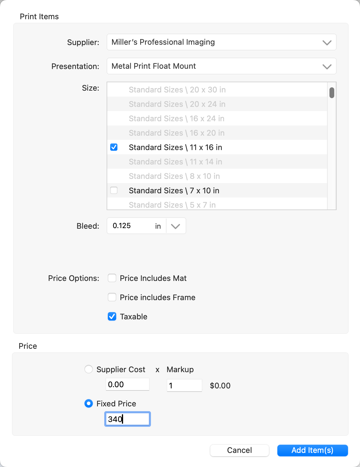 6. Click the "Add Items" button to add the prints.