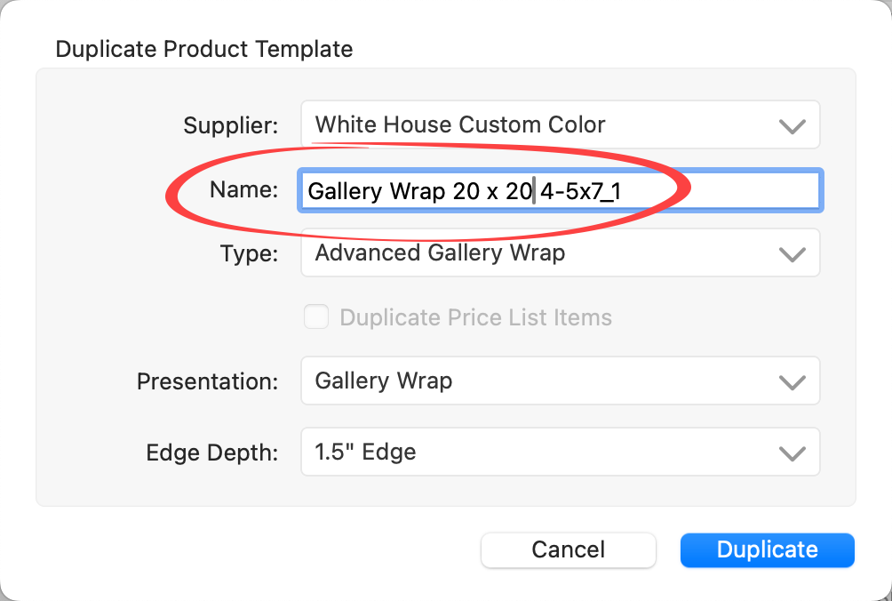 4. Type in a new name for the product template.