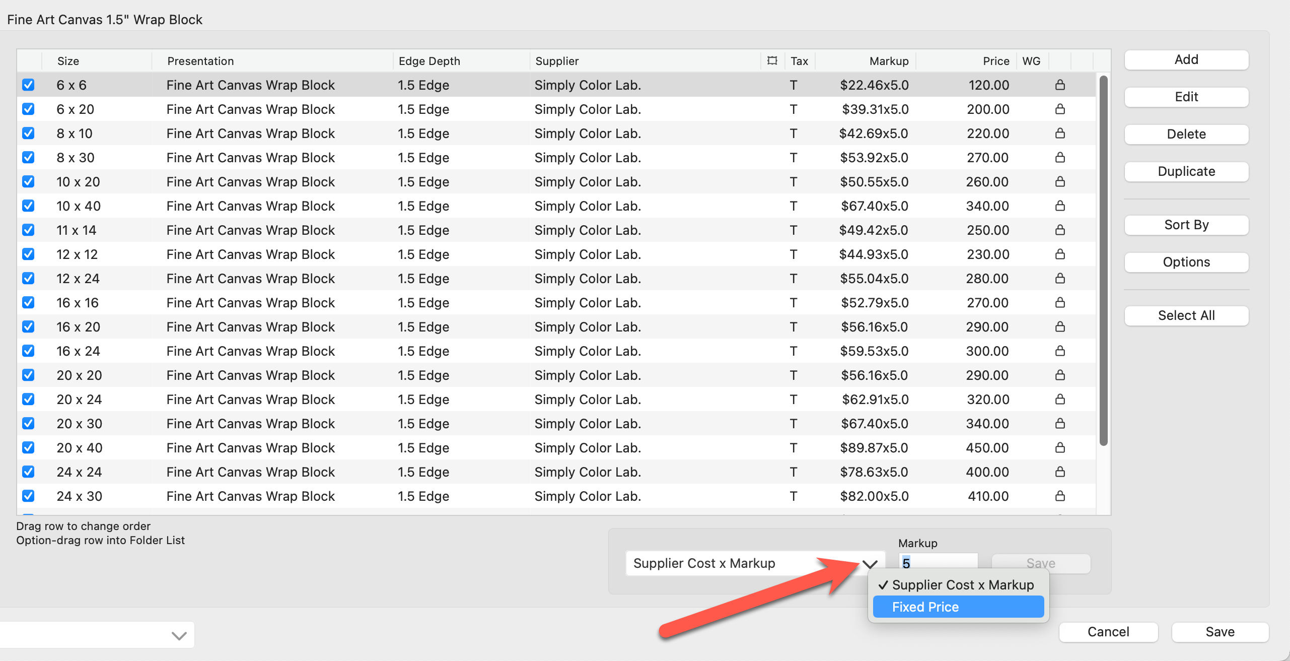 When installing Supplier Collections in ProSelect, you are prompted to select a Pricing Method - either Fixed Price or Supplier cost x Markup.  After installation, you can set or adjust the selling prices of your gallery wraps.  The pricing method can be changed at any time, regardless of the initial choice made during installation.  To toggle between pricing methods, use the drop-down arrow in the Pricing Method box (below the Pricing panel).