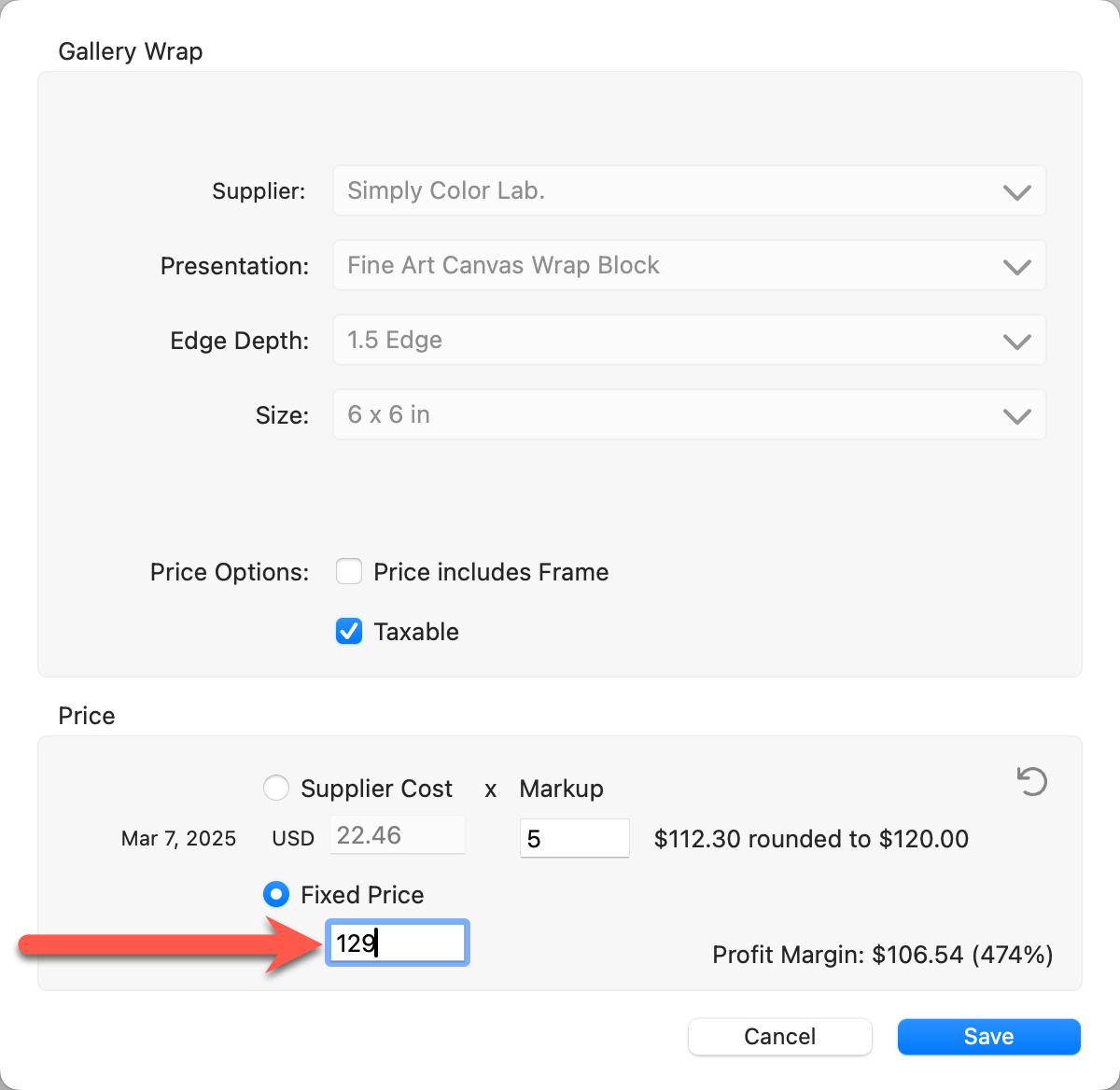 In order to use the fixed pricing method, each gallery wrap must be individually priced.  There are 3 ways of doing this.