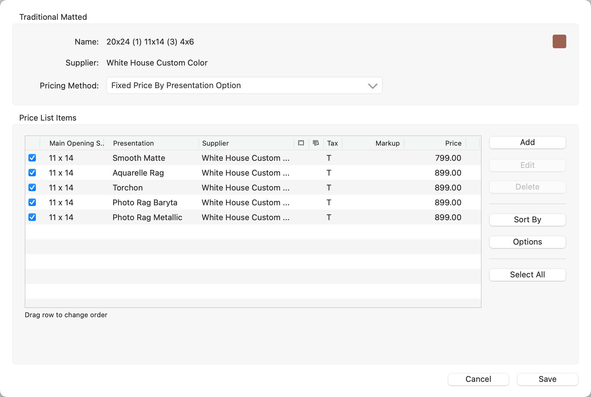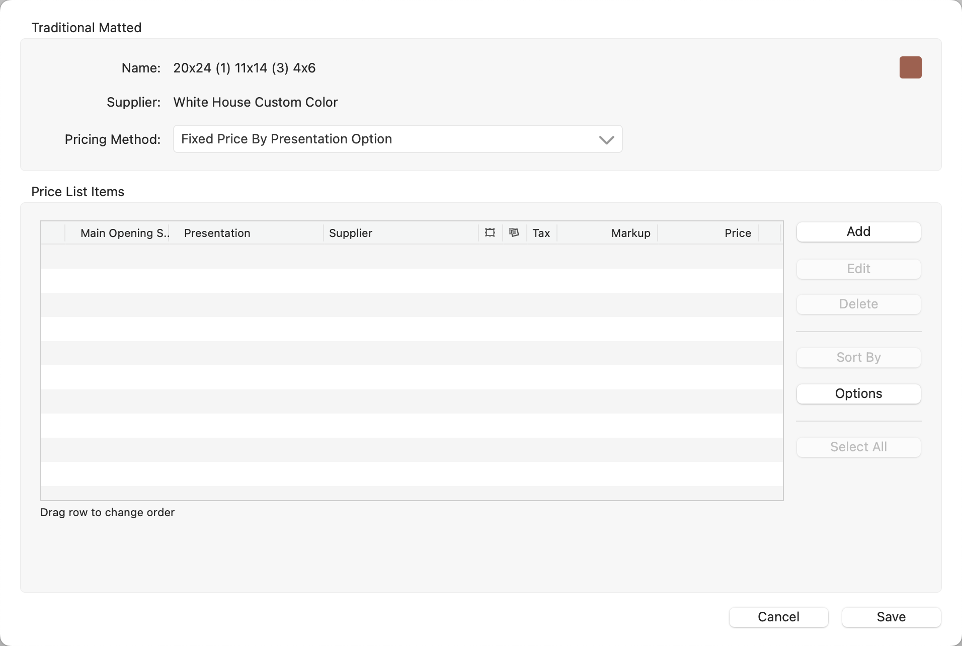 When you go to price your product templates and see that no price list items appear in the pricing dialog, don’t worry—this is intentional.  Many products, especially those with numerous size or finish options, can have hundreds of possible variations. Rather than overwhelming you with every option, ProSelect leaves it up to you to curate and add only the specific sizes and finishes you want to offer.  This approach keeps your product list clean, focused, and tailored to your studio's needs, making it easier to manage and price what you actually sell.